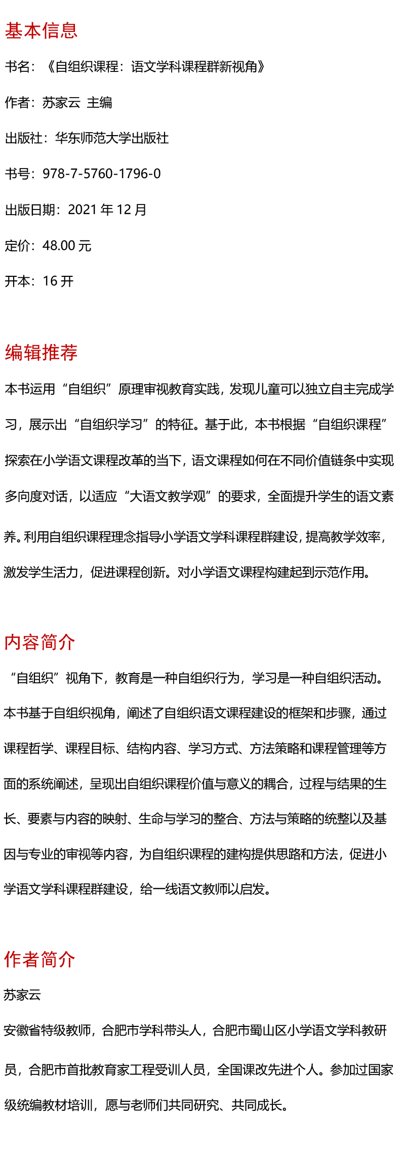 自组织课程:语文学科课程群新视角 品质课程聚焦丛书 苏家云主编 语文学科建设 语文课程教学 小学案例 小学语文教师读物 正版 华东师范大学出版社