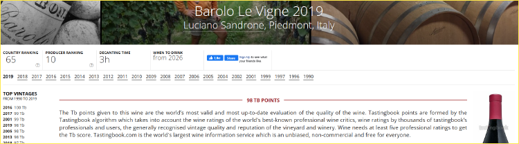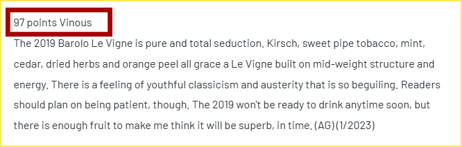 “2019年份巴罗洛Le Vigne充满纯粹和诱惑,年轻时经典简朴,需要足够长时间成熟,充足的果味相信随时间推移将更加出色。”