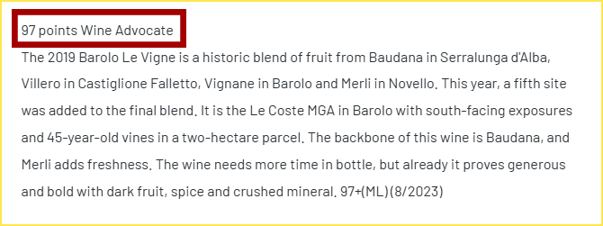 “历史性的伟大融合,来自Serralunga d'Alba的Baudana、Castiglione Falletto的Villero、Barolo的Vignane和Novello的Merli。今年新增了Barolo的Le Coste MGA,拥有一块南向约两公顷的45年老藤。需要较长时间瓶陈,已证明其慷慨而大胆,大量深色水果、香料和矿物。”