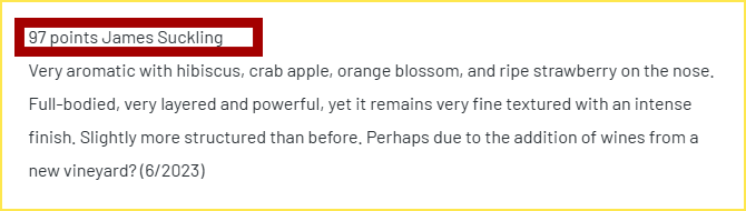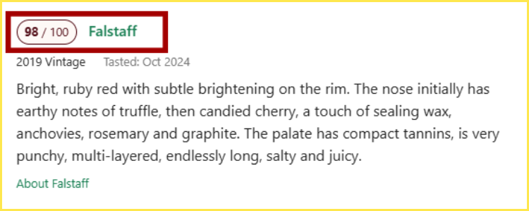 “松露泥土、甜樱桃、蜡油、金枪鱼、迷迭香和石墨气息。单宁紧致、极具冲击力的复杂层次,长度无尽,咸鲜多汁。”