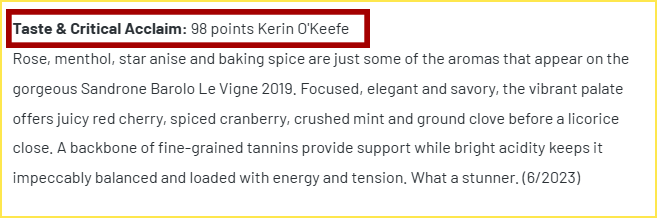 “玫瑰、薄荷、茴香及烘焙香料,2019年份的Luciano Sandrone优雅、集中且浓郁,活力多汁的樱桃、香料蔓越莓、碾碎薄荷和研磨肉桂,以甘草收尾。”