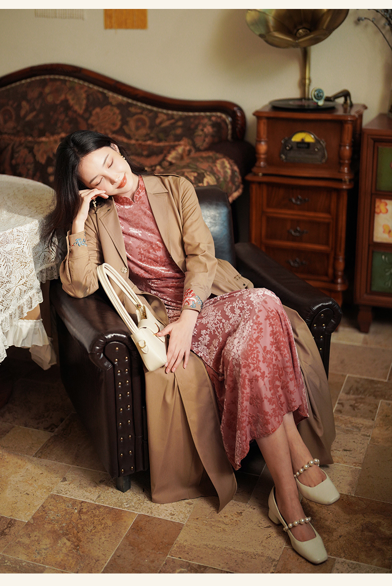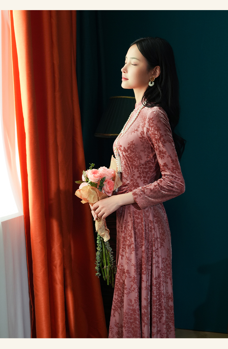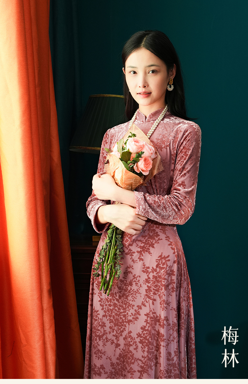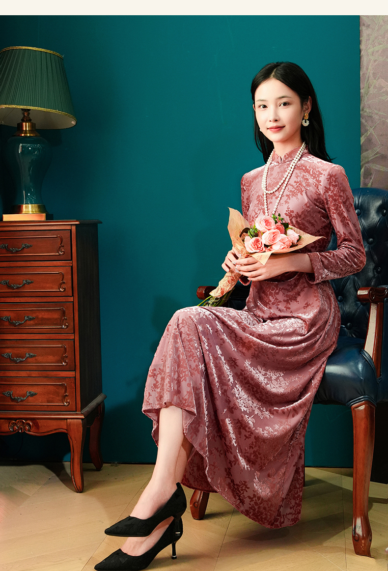 上海逸红颜梅林2025秋季新款烂花丝绒新中式腰部抽褶旗袍连衣裙