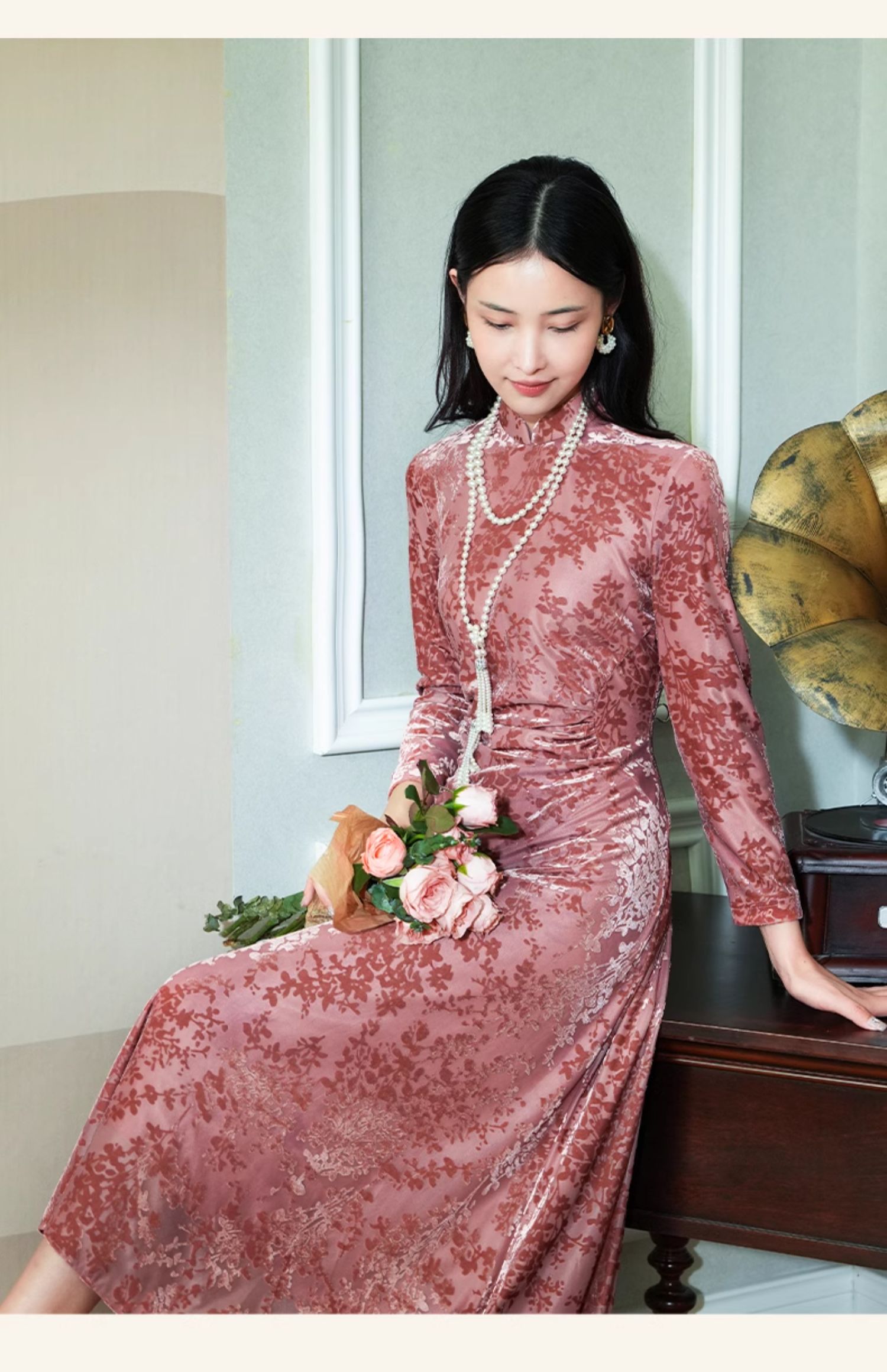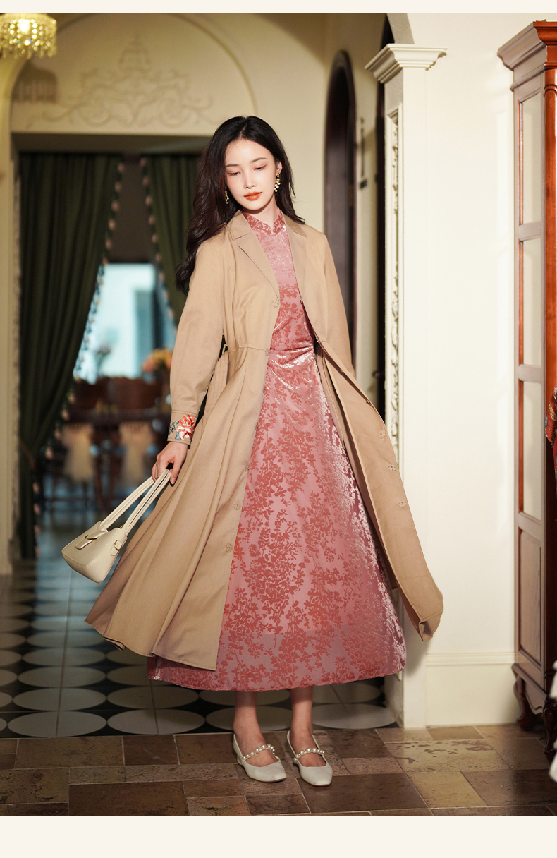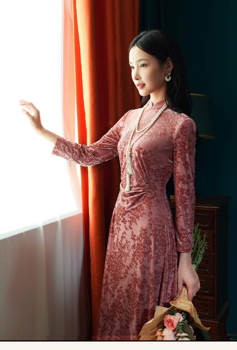上海逸红颜梅林2025秋季新款烂花丝绒新中式腰部抽褶旗袍连衣裙