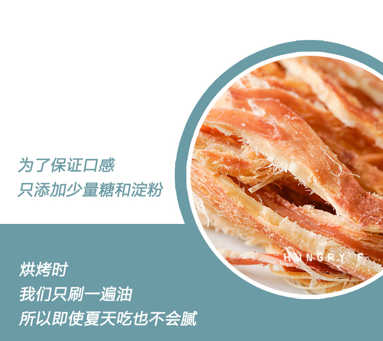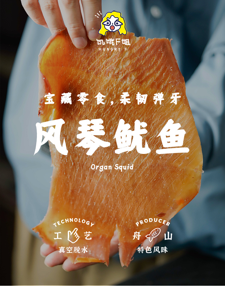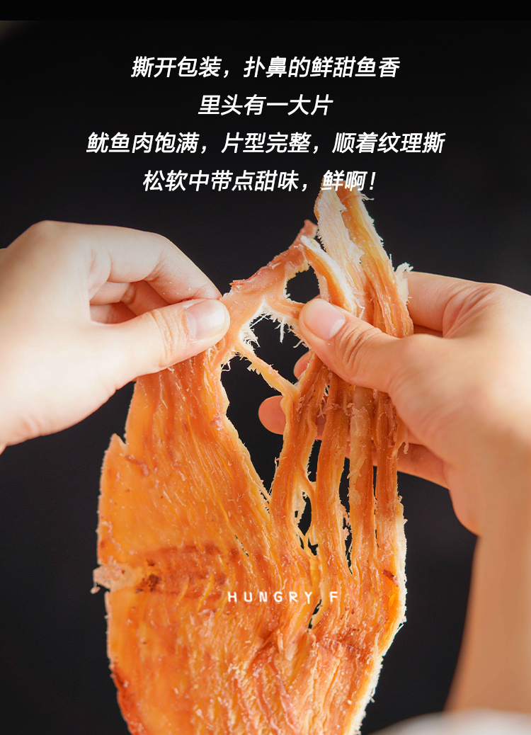 同时坚持采用舟山传统调味方式,拒绝添加任何人工色素,仅以最少量的糖与淀粉,相比市面上同类产品,含量也降低了20%-30%,更加符合健康轻食理念。调味后的鱿鱼,需要在-120℃的超低温环境中冷冻72小时以上,确保调料充分渗透,层次更丰富。腌制入味的鱿鱼严格控制在140℃左右的恒温下烘烤,避免了高温导致的营养流失和口感变差,再加上低油的配方,口感也更是鲜亮!烤好的鱿鱼片会进行压片,拉松,可以撕出鱿鱼条条,实打实的满足感!
