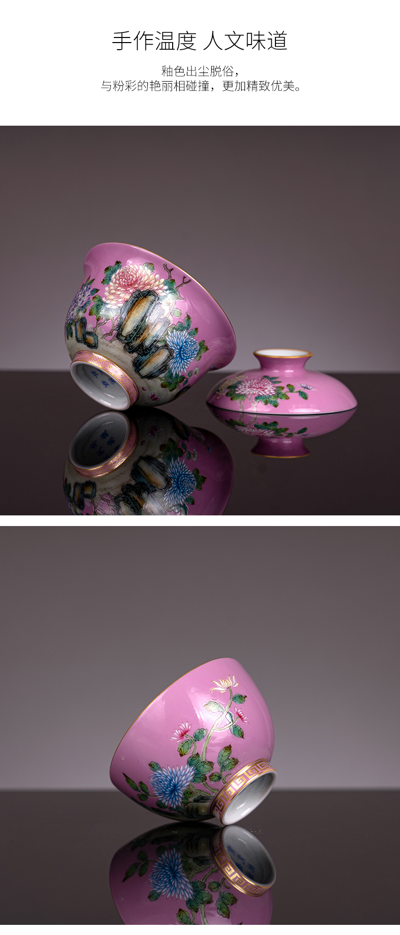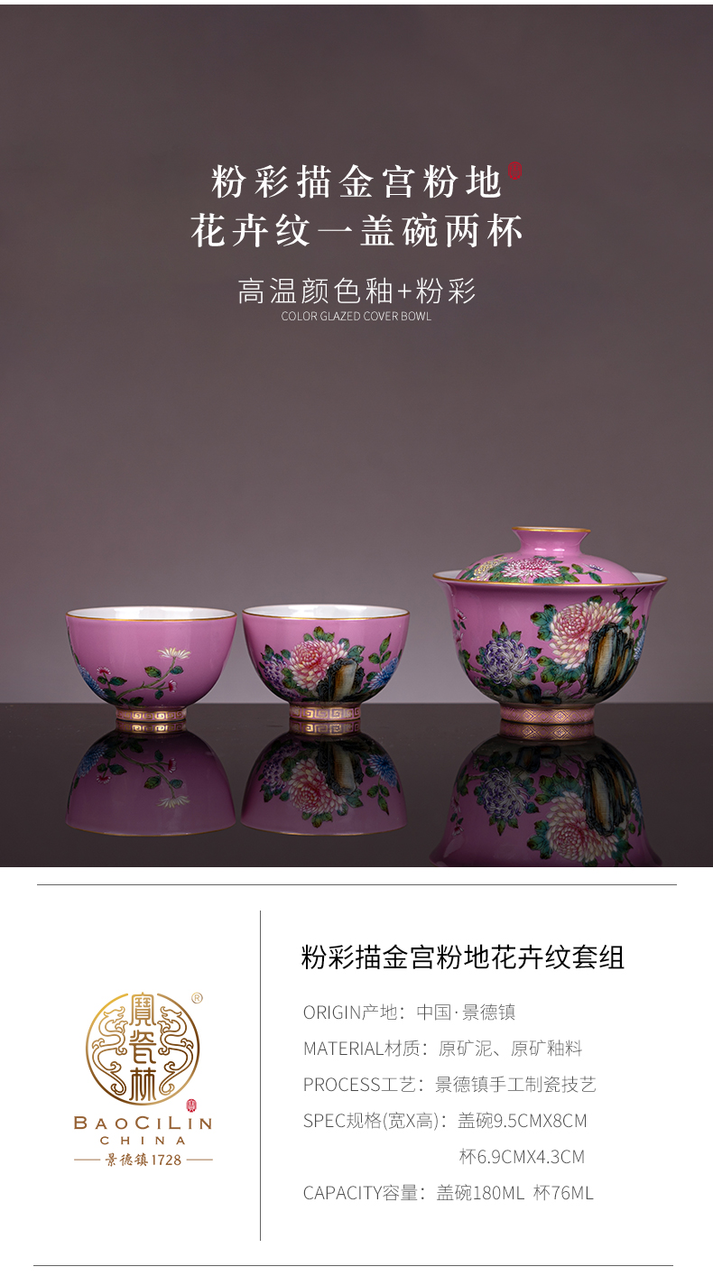 粉彩描金宫粉地花卉纹一盖碗两杯