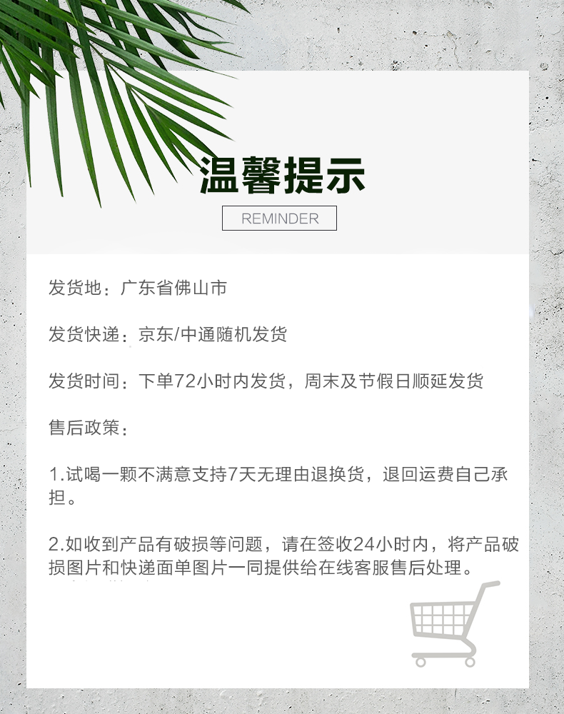 | 售后标准 | 1.试喝一颗不满意支持7天无理由退换货,退回运费自己承担。 2.如收到产品有破损等问题,请在签收24小时内,将产品破损图片和快递面单图片一同提供给在线客服售后处理。 |