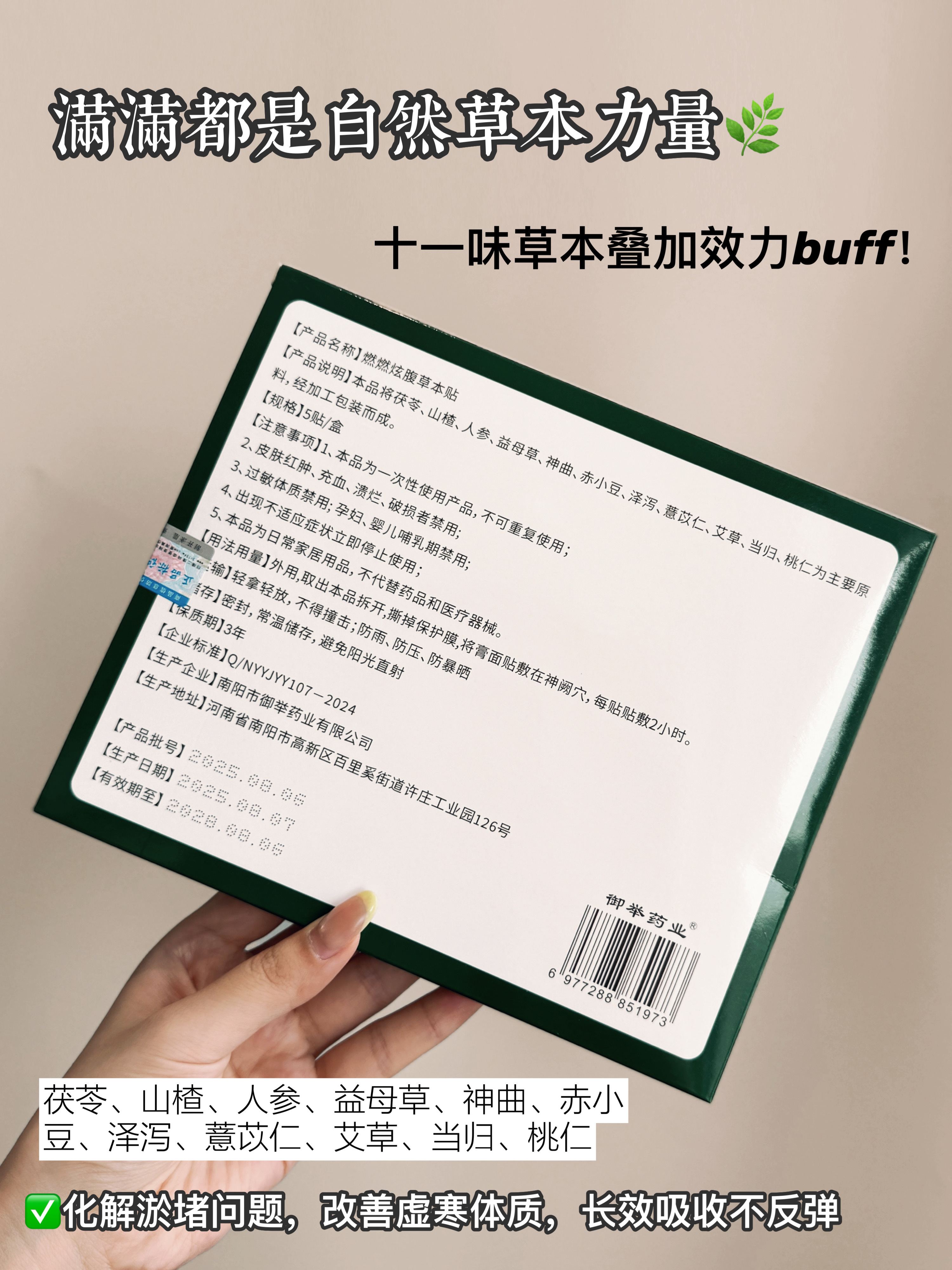 这款是专为现代人湿气重、脾胃弱、代谢差而设计的,以南怀瑾古方肚脐丸配方为基础,精选茯苓、山楂、人参、益母草、当归、艾草十一味草本协同作用,神阙穴直达❗
