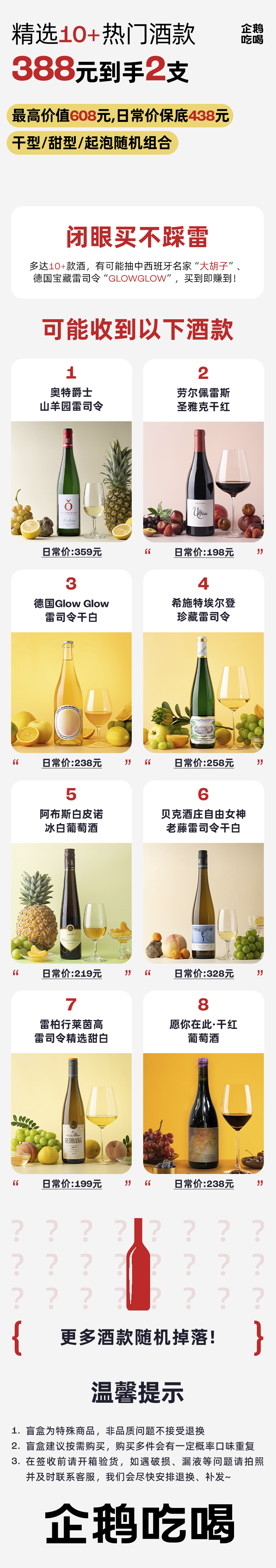 企鹅吃喝|388元随机到手2瓶 进阶精品葡萄酒盲盒 福袋最高价值608元 干型甜型起泡全品类随机