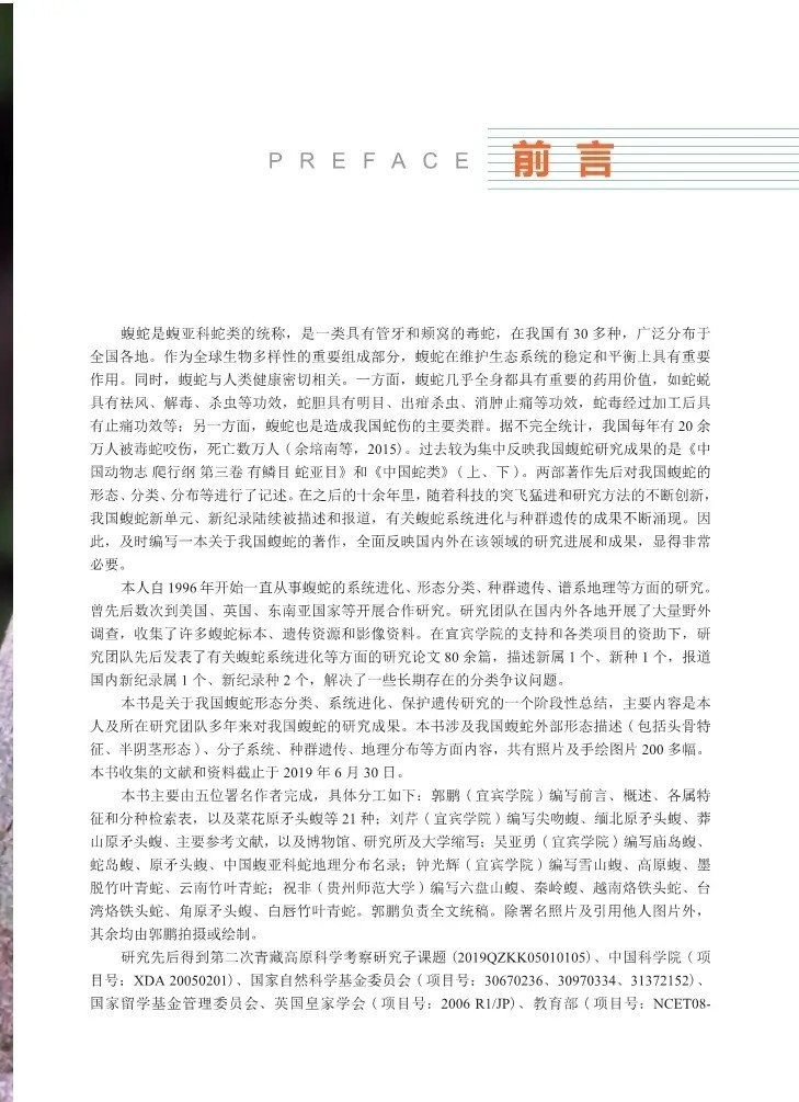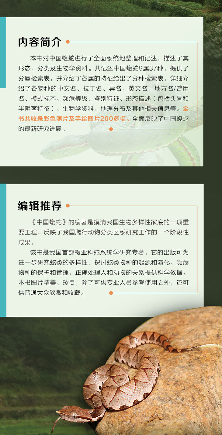 内容提要:本书基于作者多年来对蝮蛇的研究成果,结合国内外Zuixin研究进展,对我国分布的蝮亚科蛇类的形态、分类和其他生物学资料进行了整理和记述。本书共记述我国蝮亚科蛇类9属37种,提供了分属检索表,并介绍了各属的特征及分种检索表,详细介绍了各物种的中文名、拉丁名、异名、英文名、地方名/曾用名、模式标本、濒危等级、鉴别特征、形态描述(包括头骨和半阴茎特征)、生物学资料、地理分布及其他相关信息等。书中共收录照片及手绘图片200多幅。