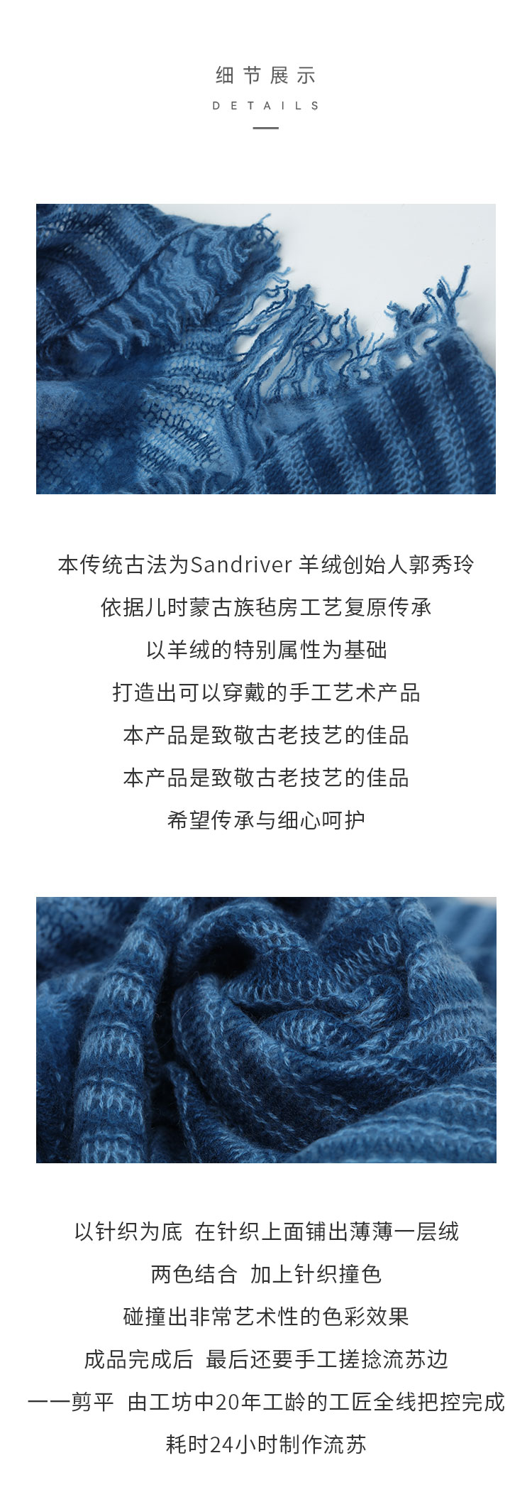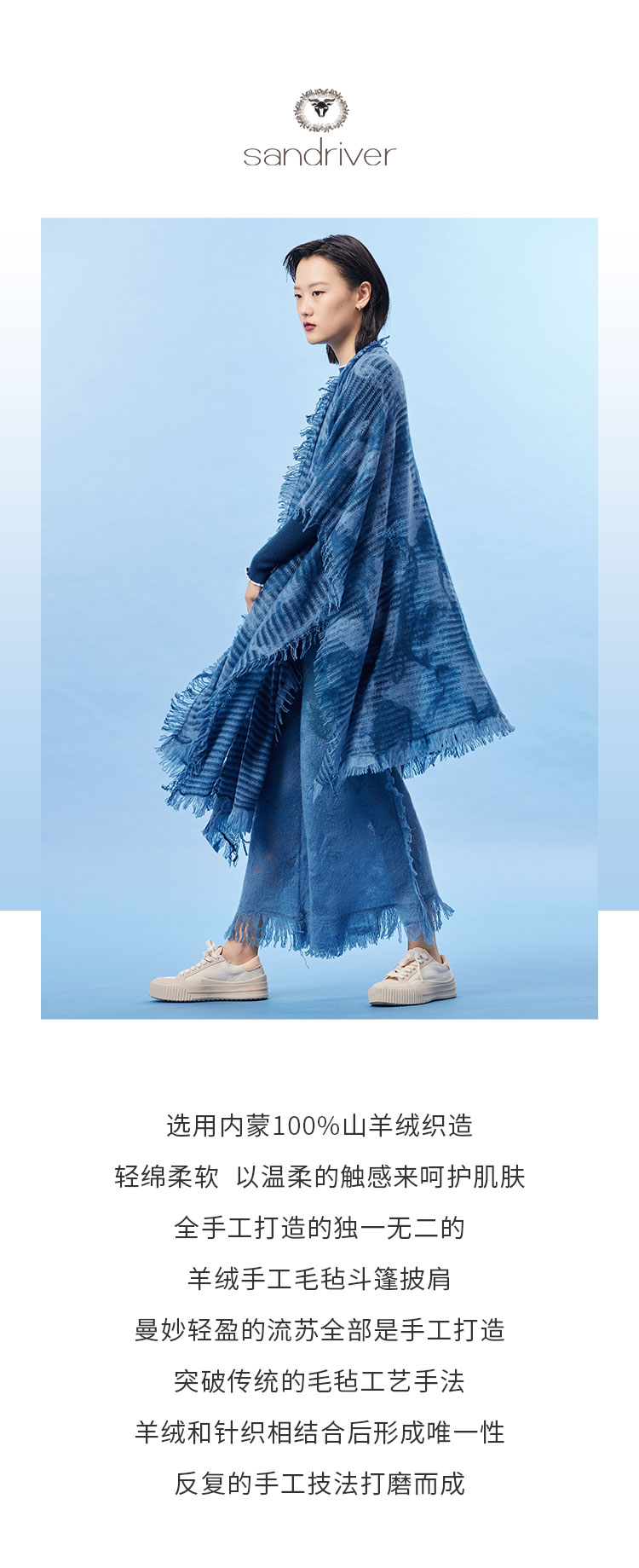 历年在巴黎时装周亮相,享誉世界的艺术羊绒品牌[Sandriver 沙涓]由羊绒布道者郭秀玲女士创立。阿拉善自有牧场纯种羔羊绒,日本国宝设计师小筱顺子,上海自有基地精工细作。承载羊绒情怀,坚持匠人品质。