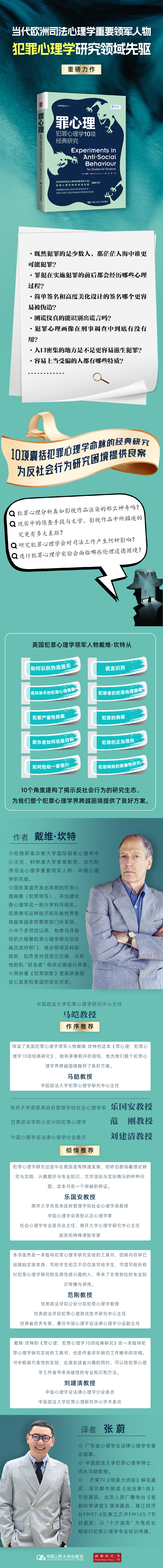他在本书中打破了深陷艺术化浸染的大众只能从影视、文学作品了解犯罪的局面,揭开犯罪小说、影视作品有关犯罪题材的神奇面纱,通过数据收集、统计以及课堂实验模拟典型犯罪的生态,紧紧围绕犯罪心理学领域中的关注热点——反社会行为——予以展开,从实验、调查、案例研究和情景模拟几个板块,包括如何伪造签名、谎言识别、连环杀手的犯罪心理画像、犯罪者的犯罪地理画像、犯罪严重性探索、犯罪的诱惑、欺诈者如何说服目标、犯罪的正当理由、如何抢劫一家银行、犯罪网络的探索性研究共10项研究与实验,事无巨细但简单易懂地将这些板块的实验和研究方法传授给所有读者,以帮助读者从科学方法和传授者经验中掌握分析、预测、判断犯罪行为过程及犯罪人的特点,鼓励读者开启一段迷人且冒险的科学研究之旅。