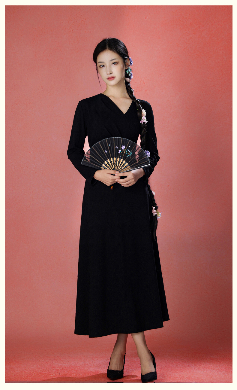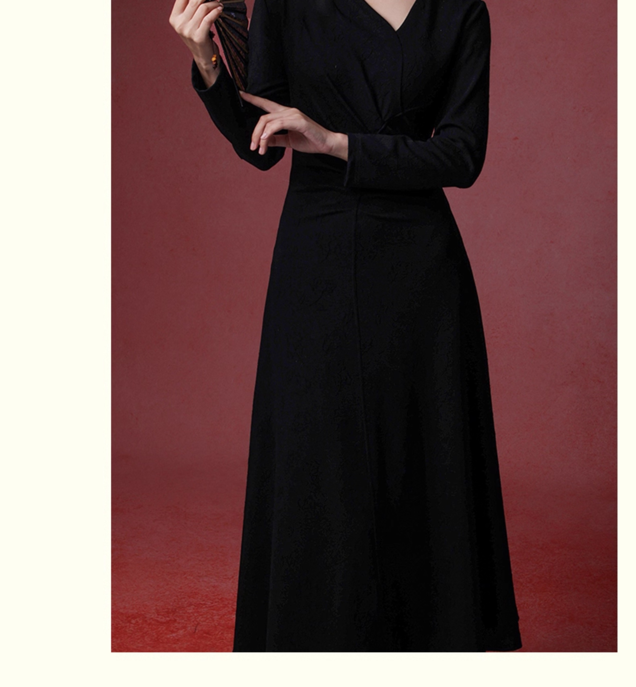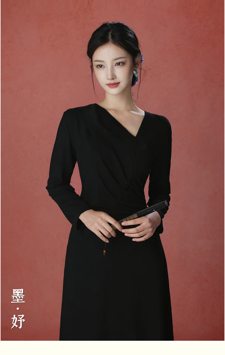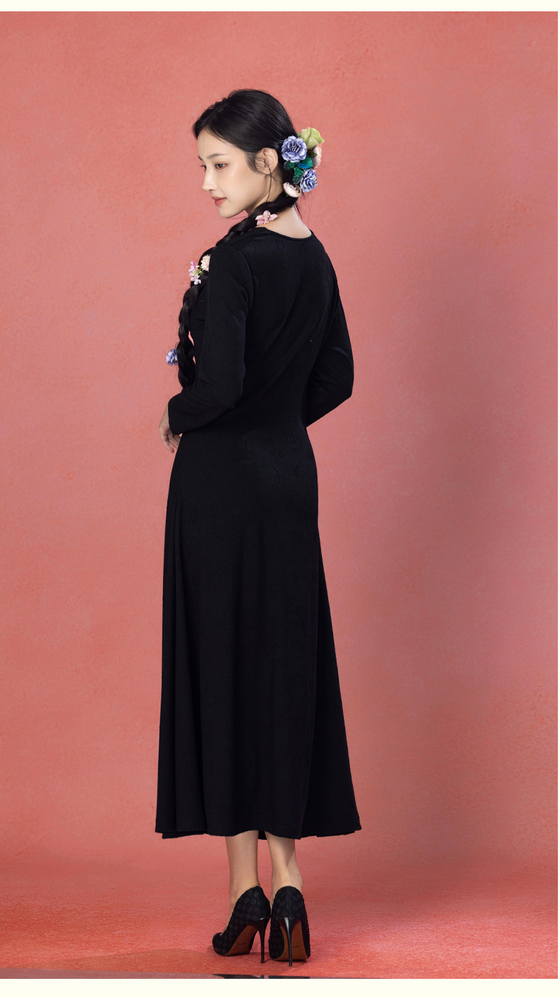 逸红颜墨妤2025深秋新款弹力暖感新中式显瘦小黑裙打底连衣长裙女