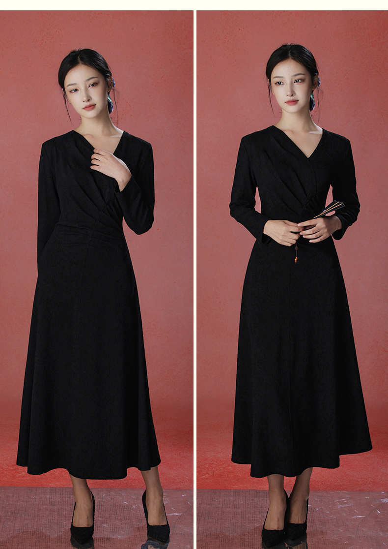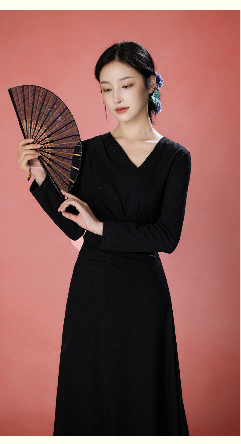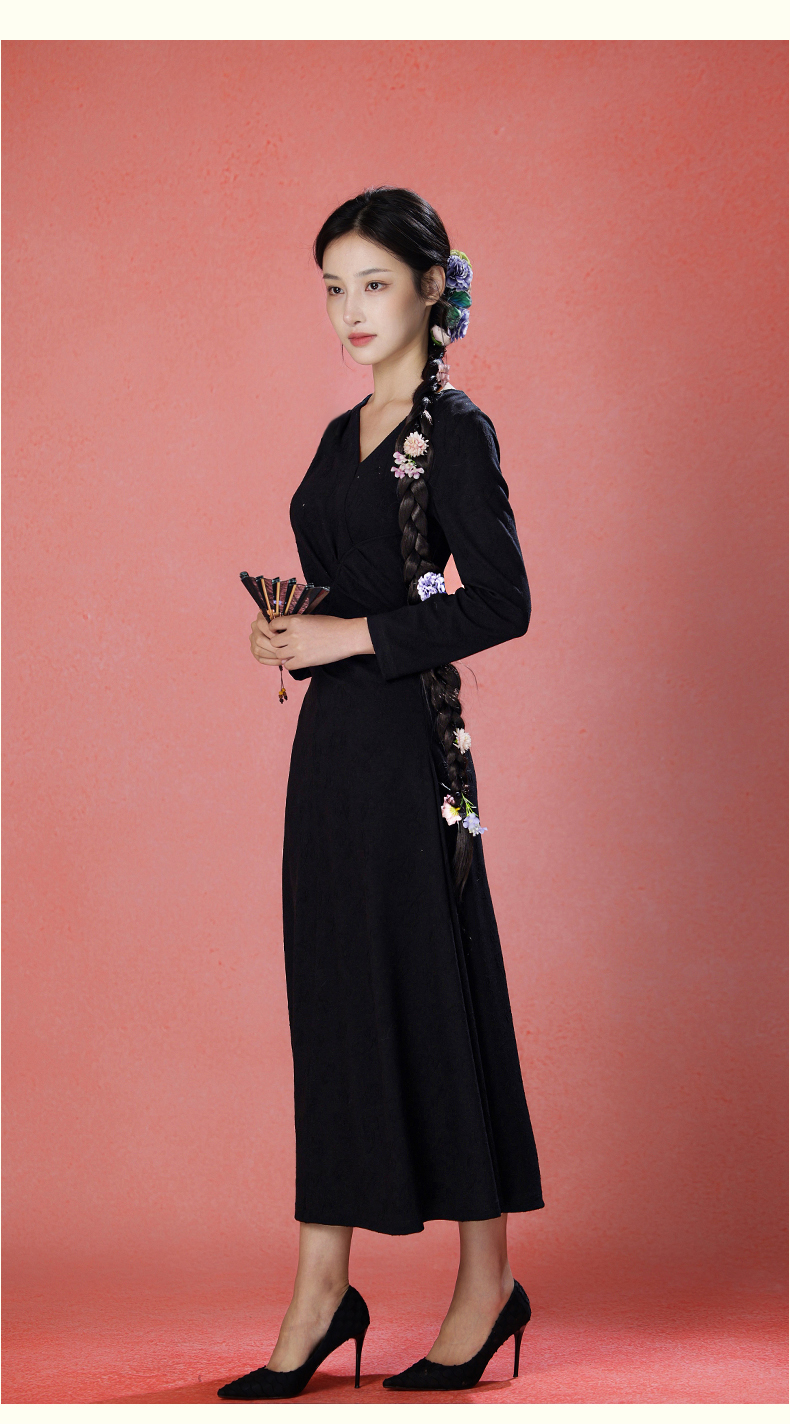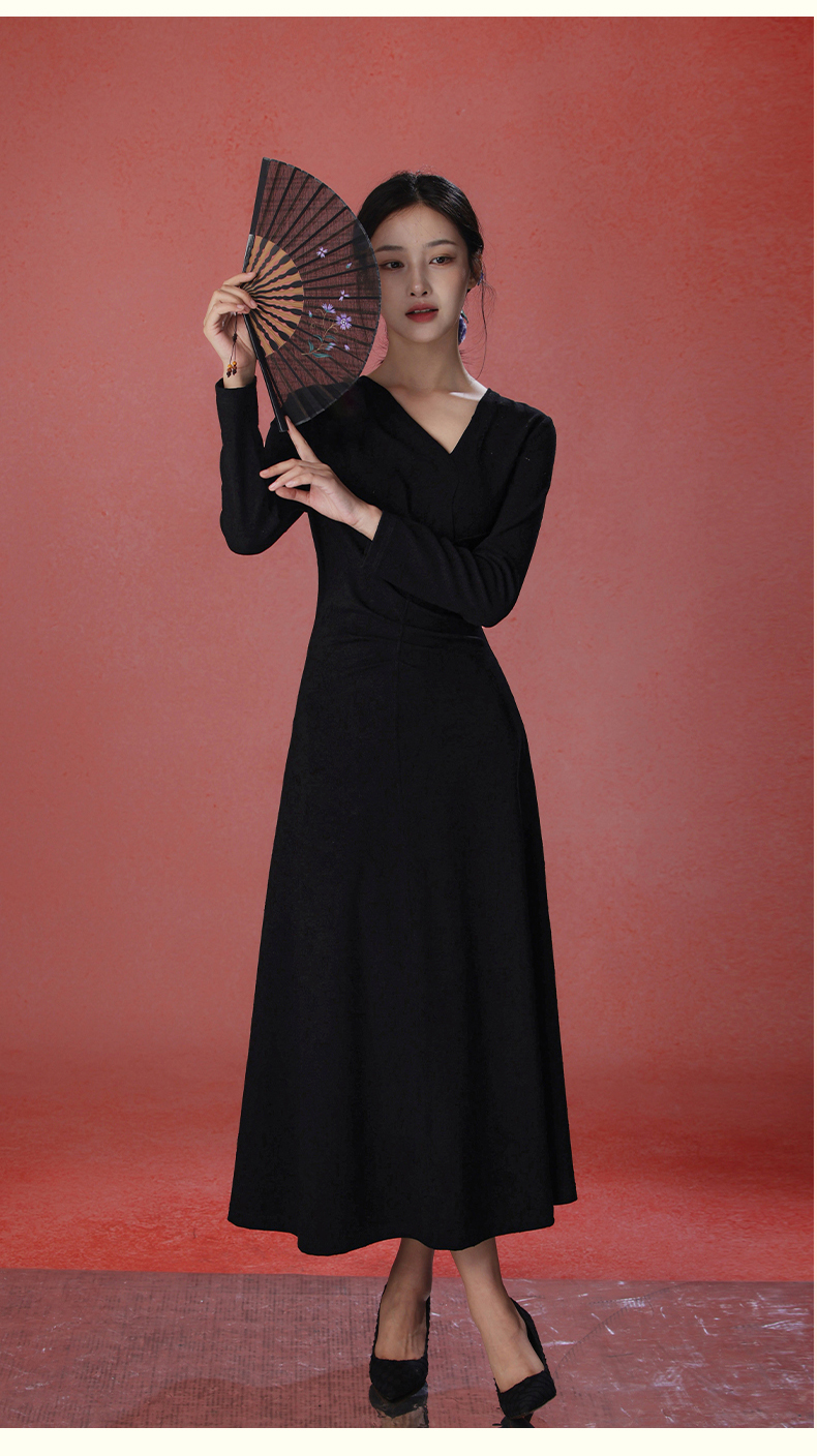 逸红颜墨妤2025深秋新款弹力暖感新中式显瘦小黑裙打底连衣长裙女