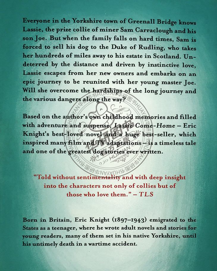 埃里克·奈特(1897-1943),作家、剧作家,生于英国西约克郡,少年时代移居美国,婚后定居于宾夕法尼亚州,1943年,因飞机失事不幸身亡。《灵犬莱西》成书于1940年,1943年被搬上荧幕,小说和电影都获得了巨大的成功,此后,多次被翻拍成电影和电视剧,感染了一代又一代观众。