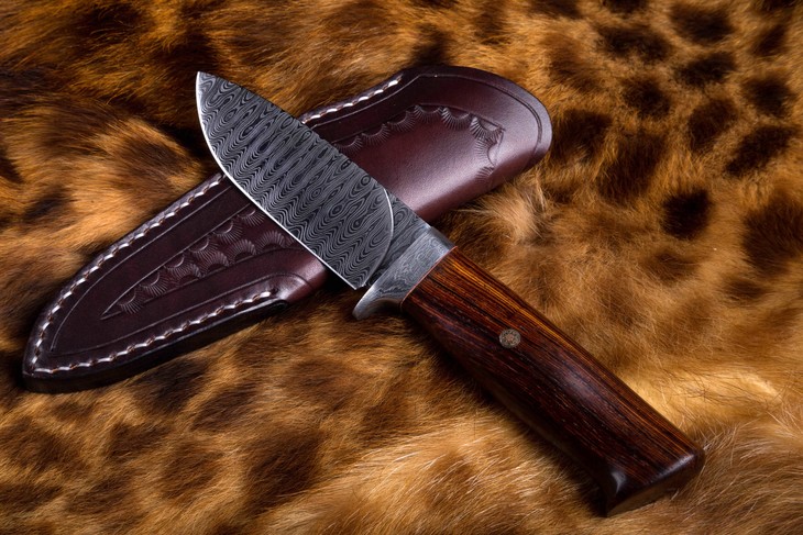 刀鞘为精选进口小牛皮,纯手工雕花缝制。