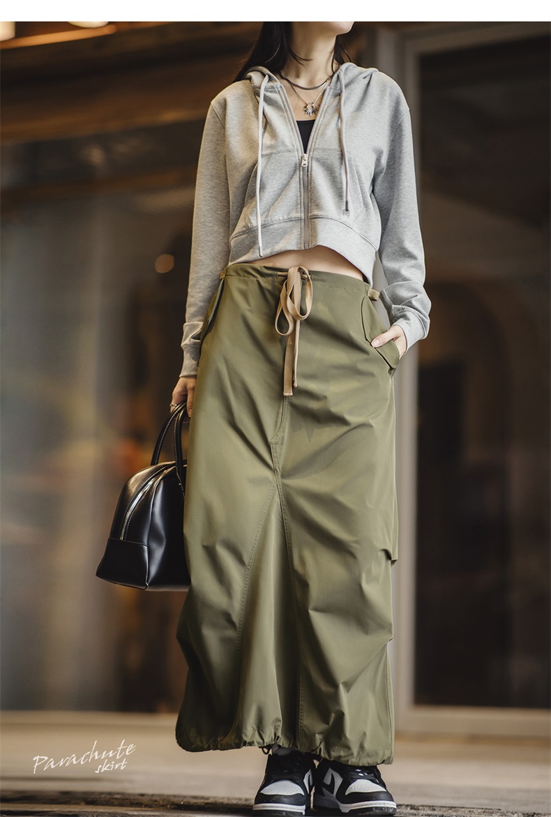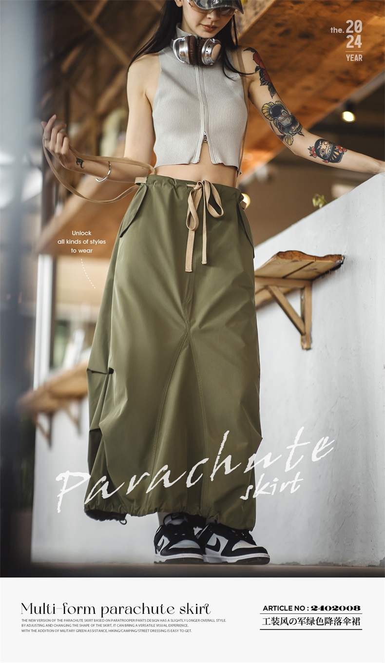 马登复古抽绳工装风伞裙显瘦半身长裙子潮褶皱设计感背带裙女