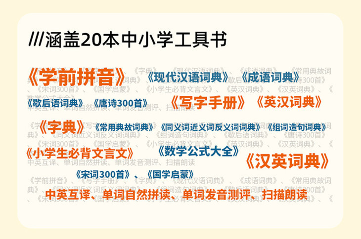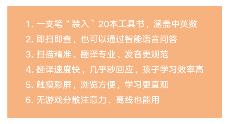 这支笔却涵盖了《汉英词典》、《现代汉语词典》、《成语词典》、《数学公式大全》、《唐诗300首》…20本中小学工具书,中英数全都囊括。