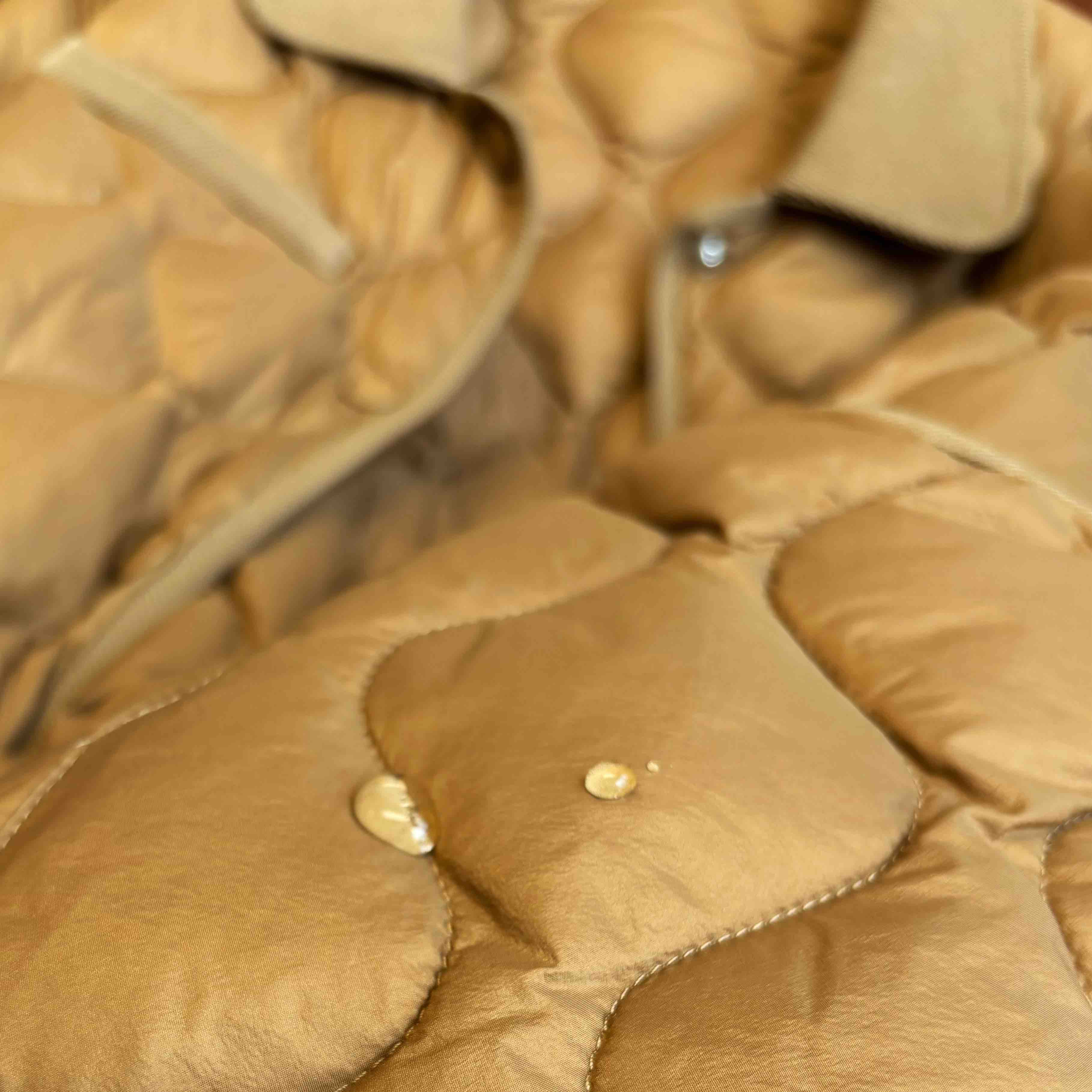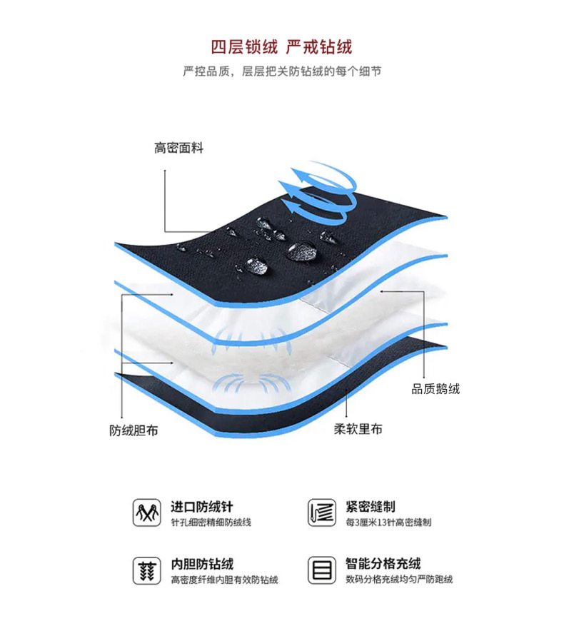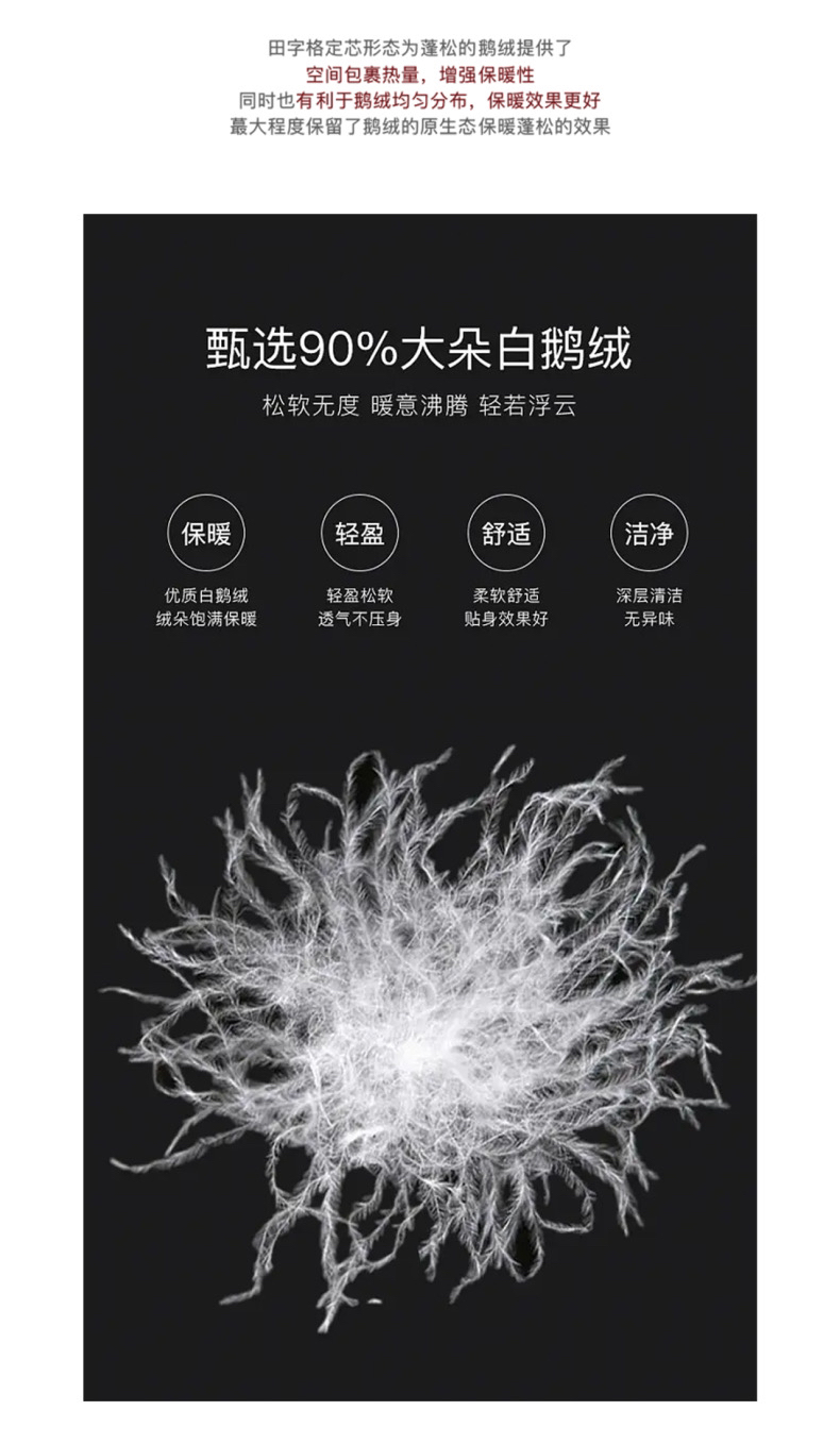 白鹅绒填充140g左右,一般轻薄羽绒服 充绒量是70g左右,这个整体好比2件 轻薄的羽绒服的充绒量。