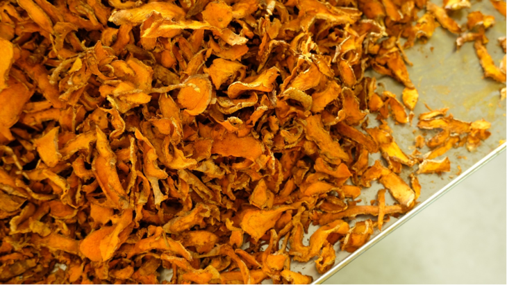 去年我们购置了一台烘干机,整个过程采用低温烘干的方式,能够更好地保持食物原本的营养。将姜黄清洗后,切片,然后送入烘干机,经过60度,连续18个小时,才能完全干燥。