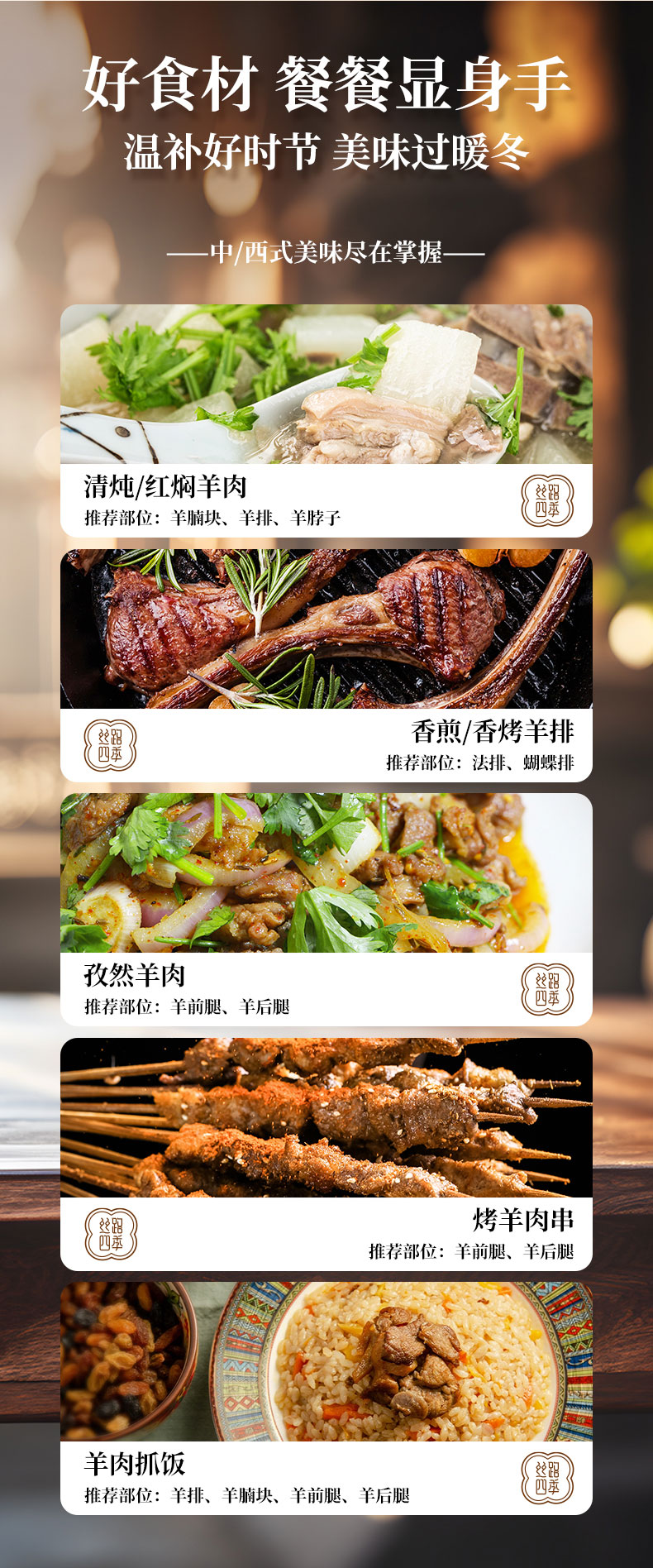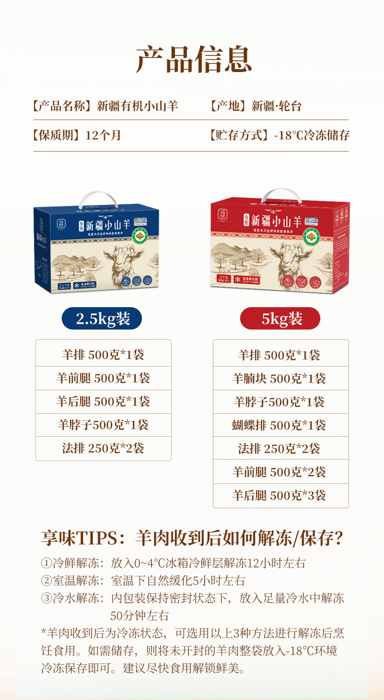 5斤礼盒装:羊后腿500g*1;羊前腿500g*1;羊排500g*1;羊脖子500g*1;法排250g*2。