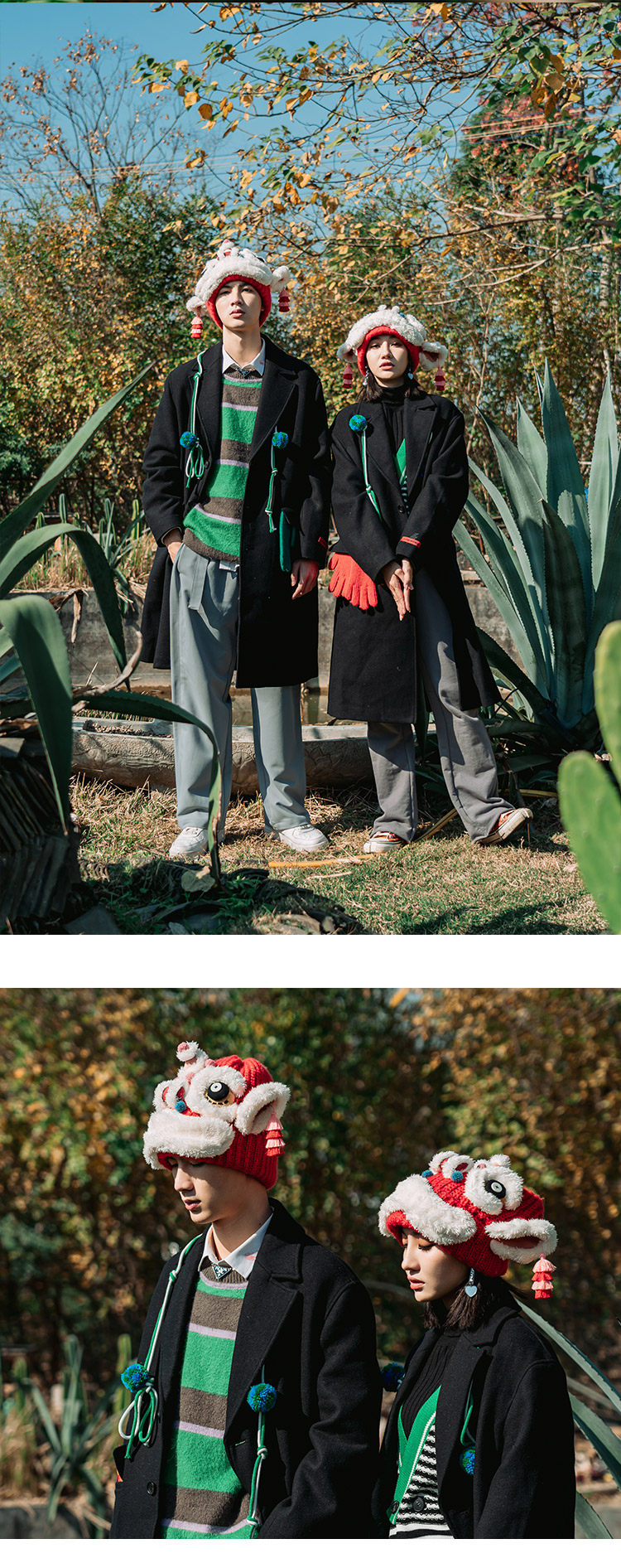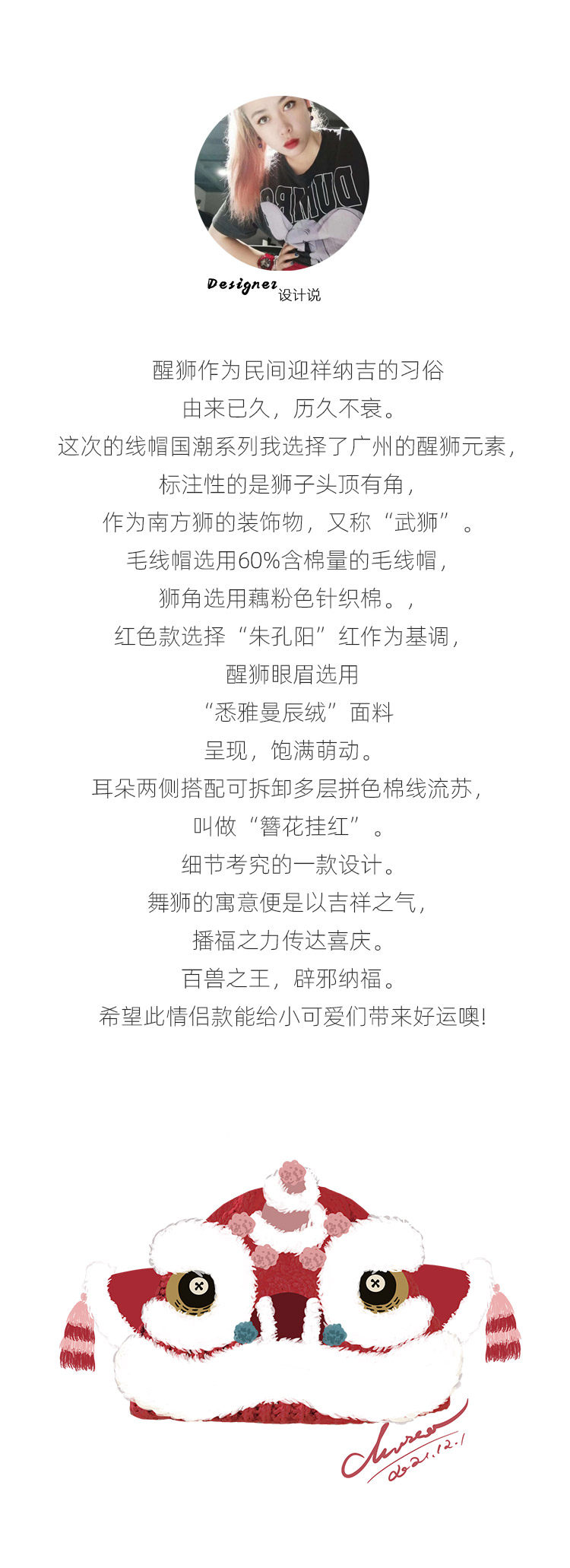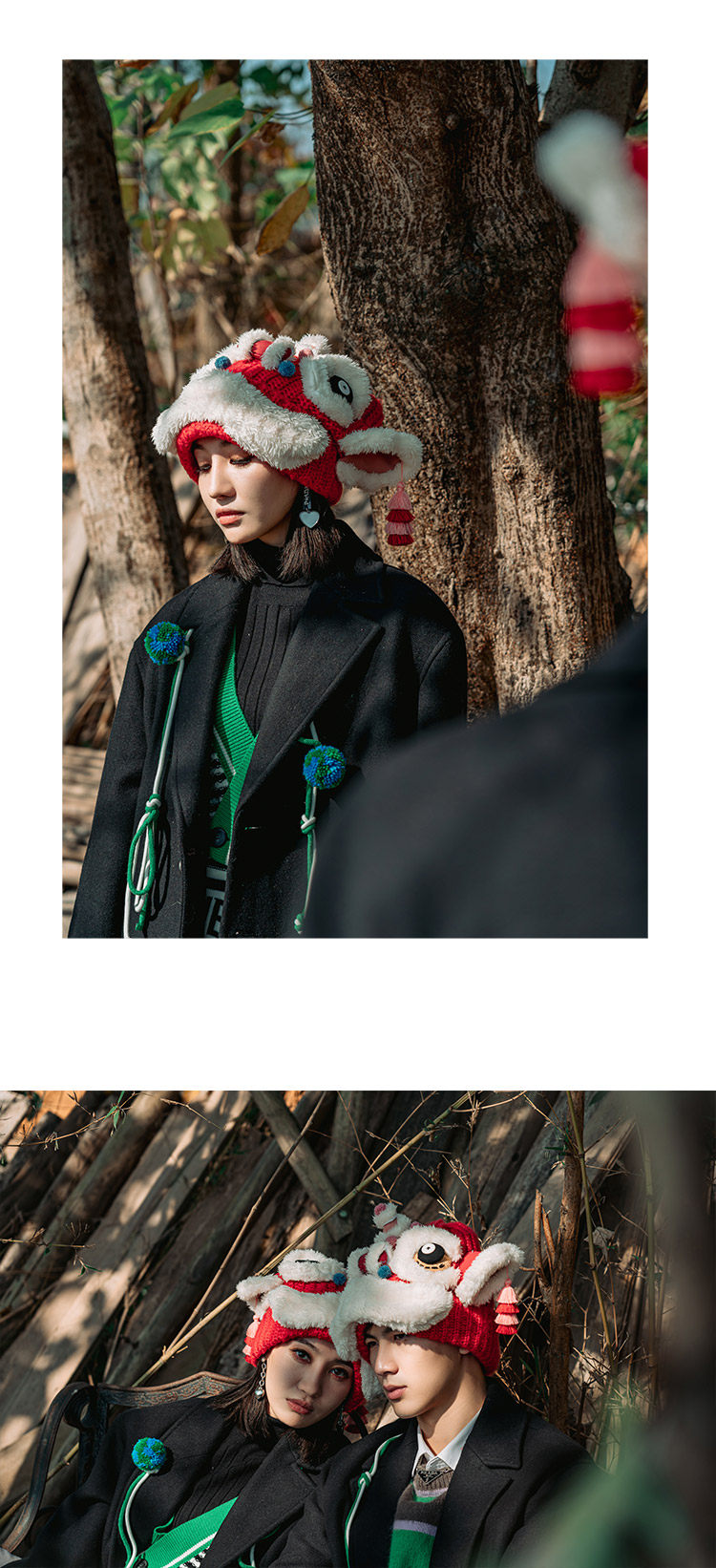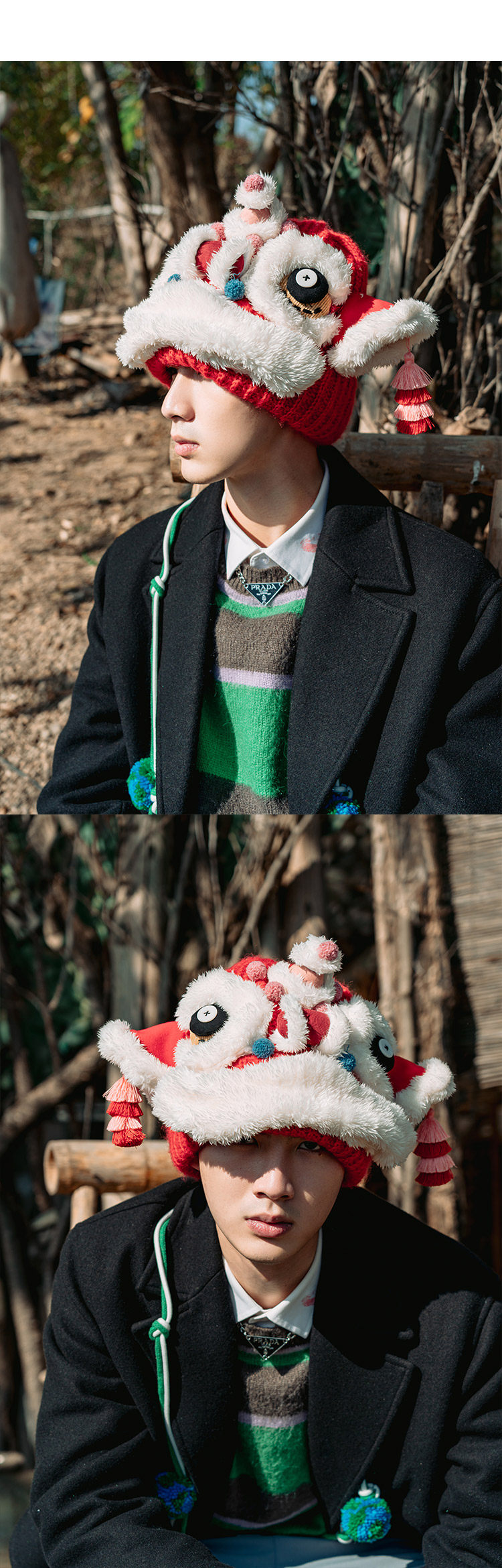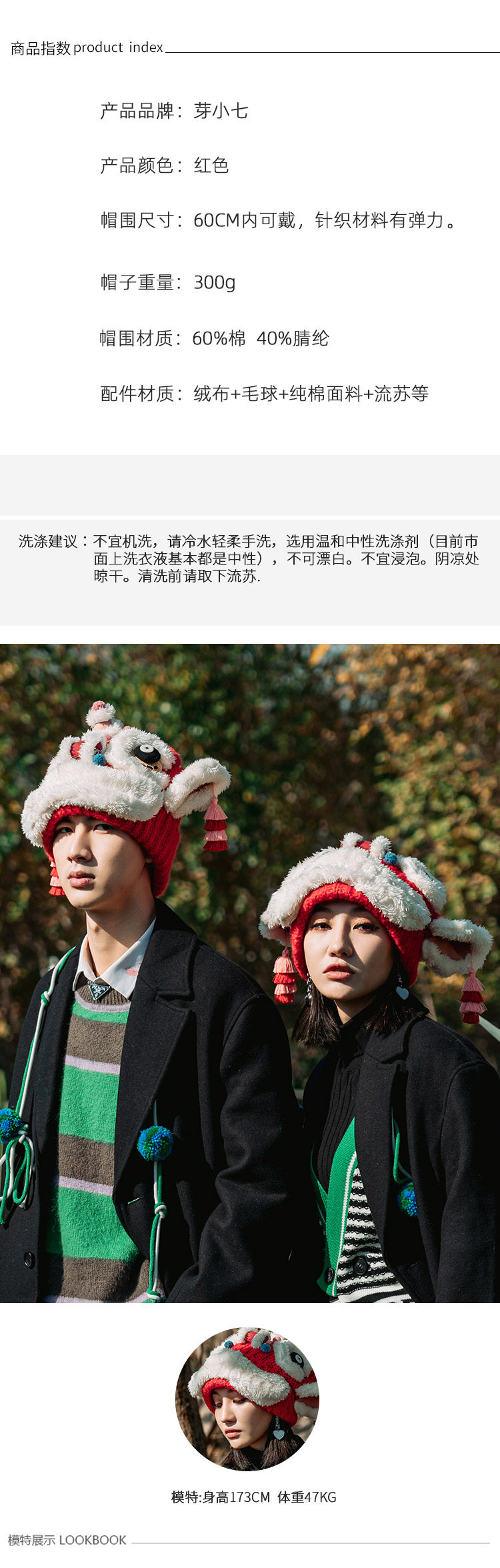 【1.21-2.6停发】芽小七原创国潮红色醒狮毛线保暖帽子成品男女冬季东北加绒防寒