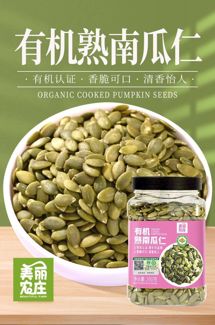 美丽农庄有机熟南瓜仁 原味烘焙香脆零食无壳种子280g/罐