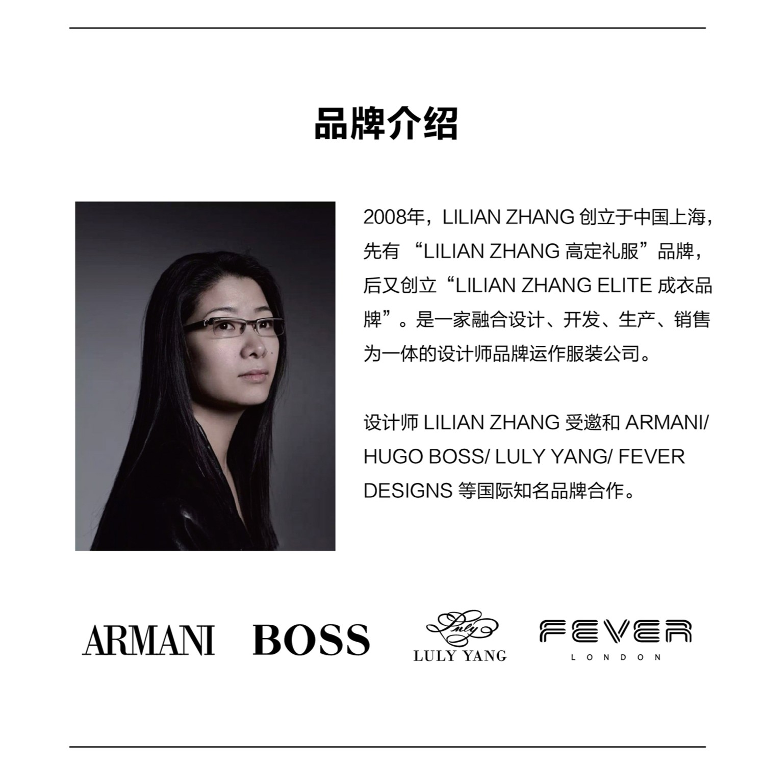 - LILIAN ZHANG ,创立于2008年,为 ARMANI 等国际品牌设计创作时装。 LILIAN ZHANG 坚持原创设计、坚持立体剪裁、坚持颠覆奢侈品价格、坚持简约经典 ,深受时尚女性喜爱。