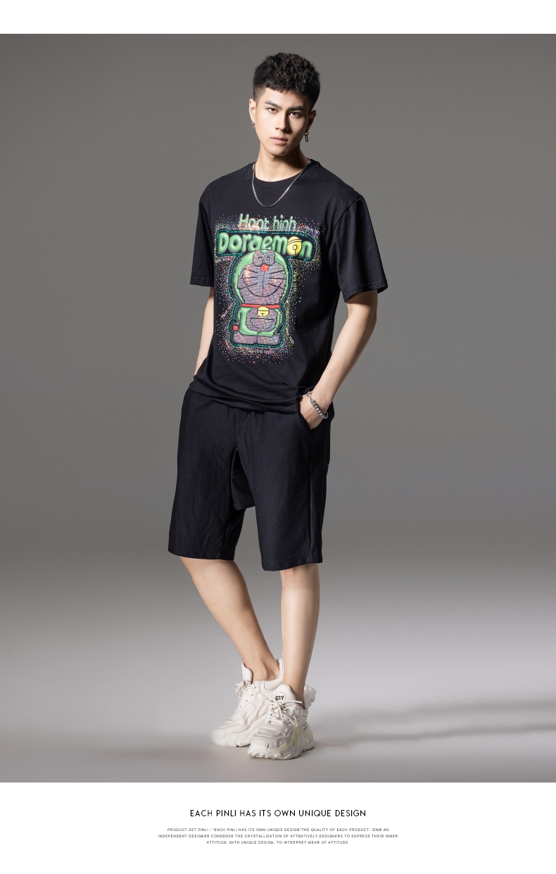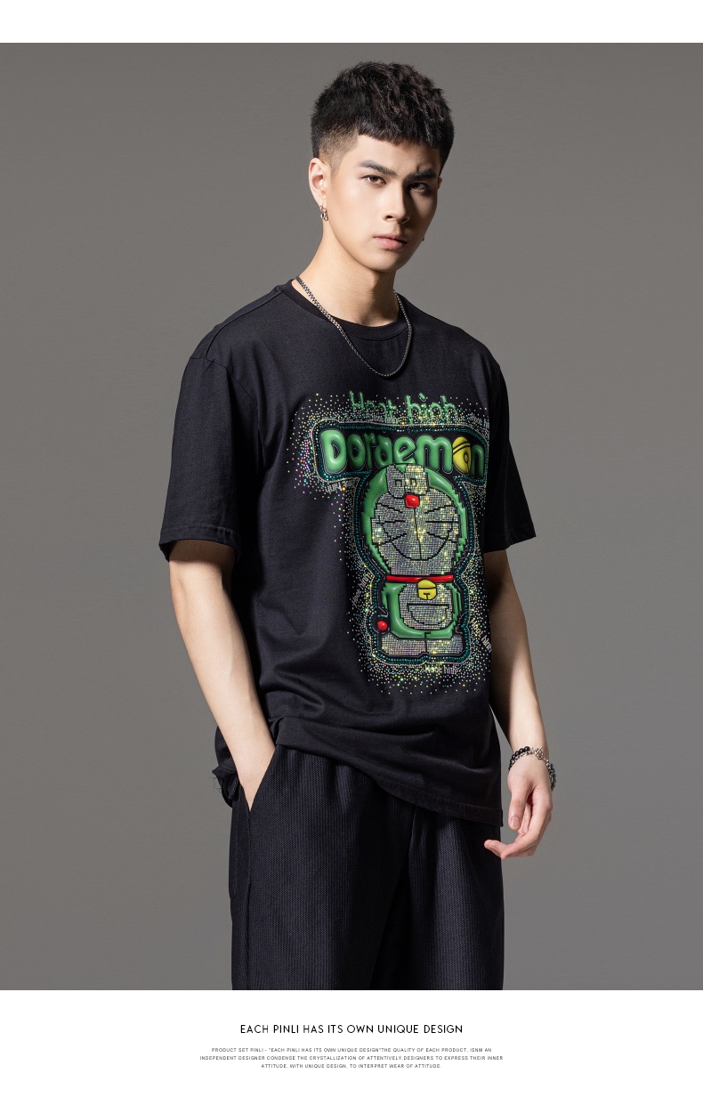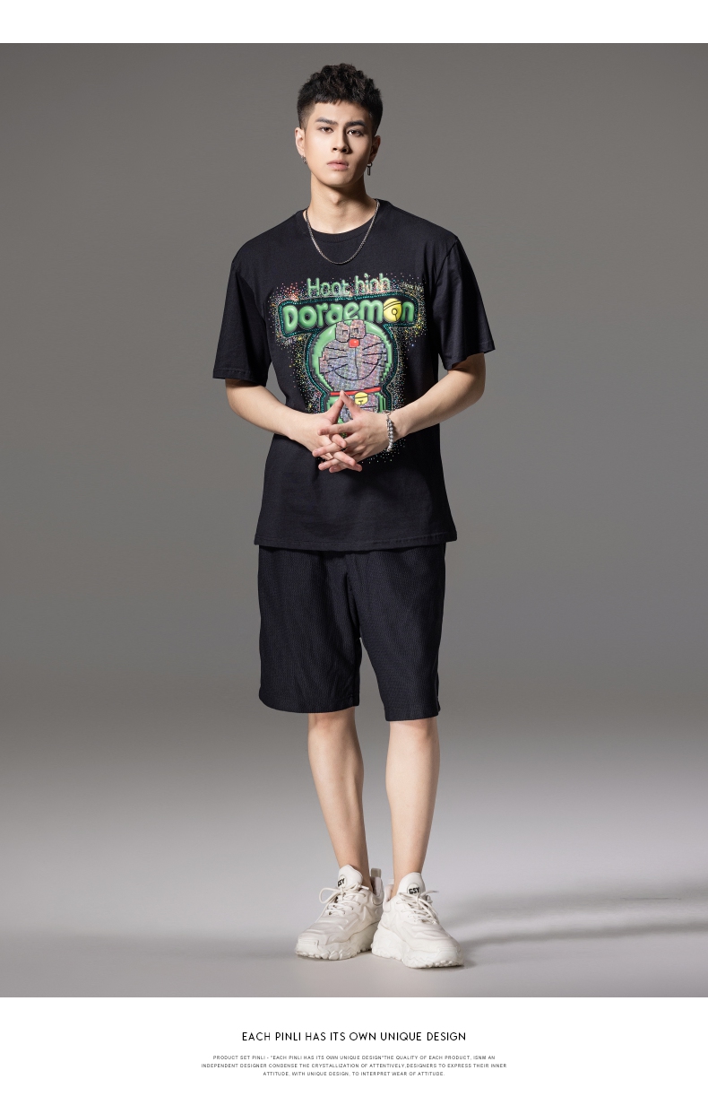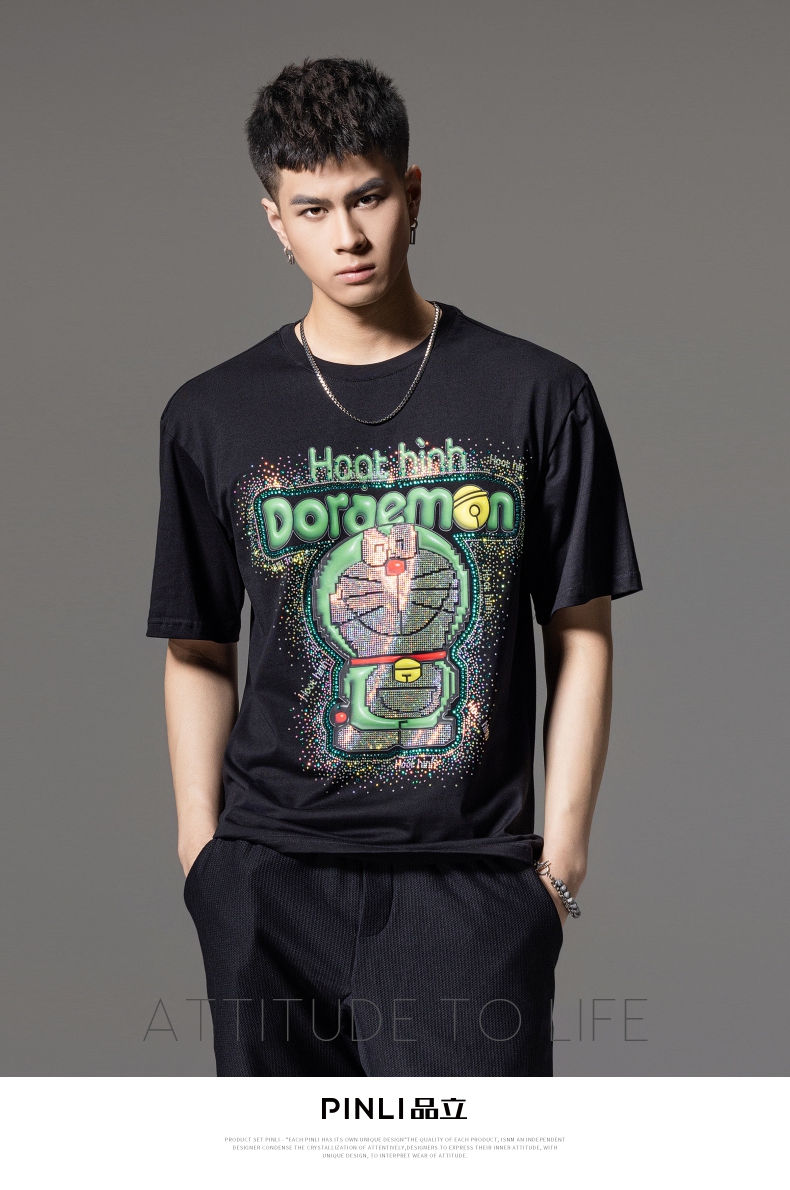 PINLI品立夏季新款印花烫钻纯棉短袖T恤男士潮牌卡通休闲体恤BG242111040