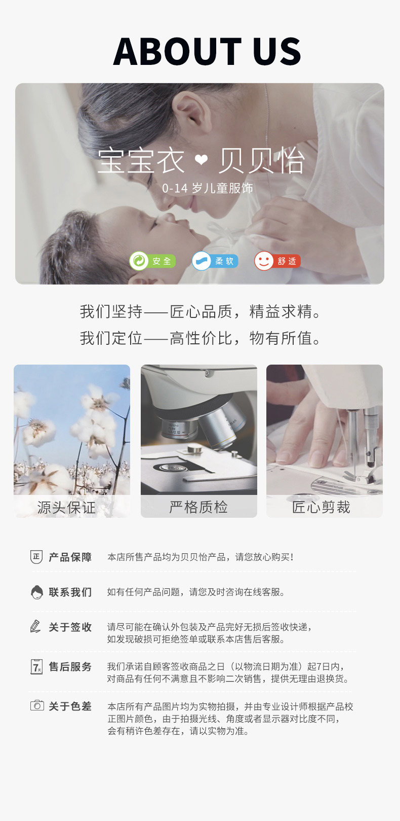 - 贝贝怡专注0-6岁婴幼儿服饰,坚持安全、柔软、舒适的产品理念,为千万中国家庭提供超高品质、安全可靠的婴幼儿服饰产品,妈妈放心,宝宝开心!