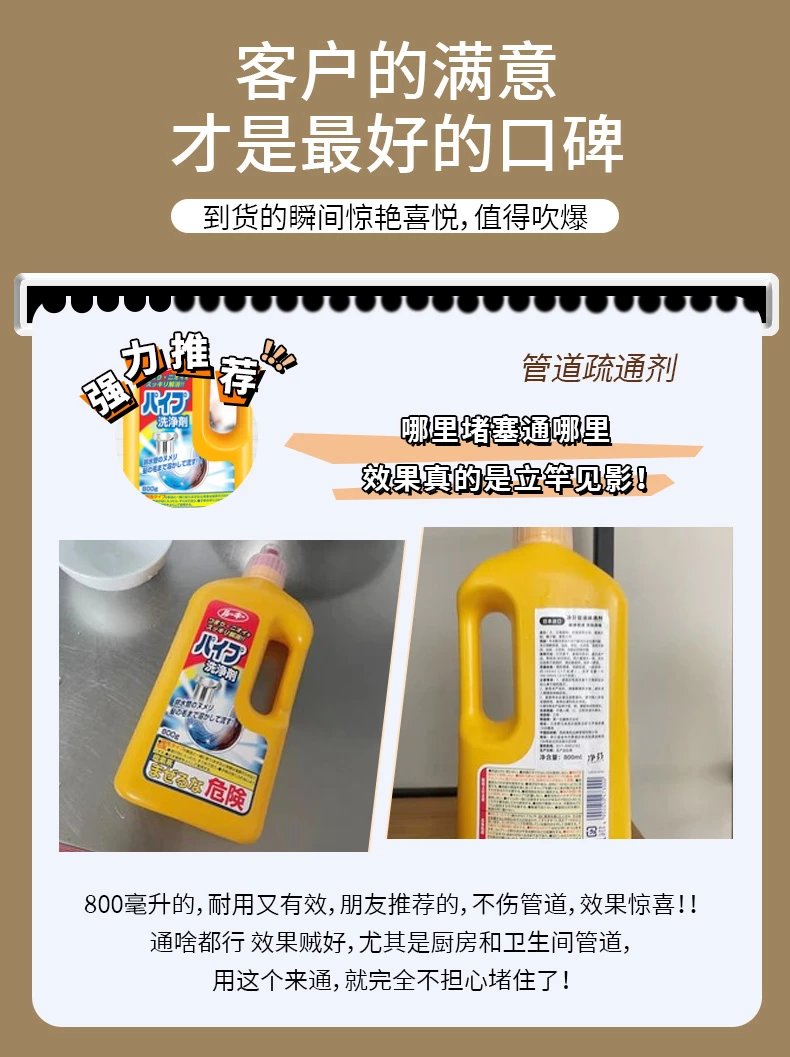 快速分解毛发及油脂,倒下去等几分钟,你会发现“嗖”的一下就不堵了,家里的异味都消失了,就是这么神奇~