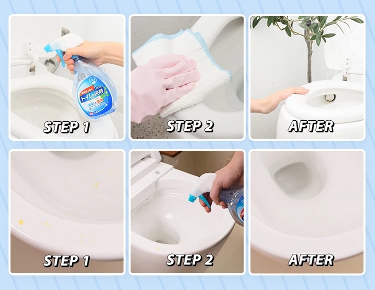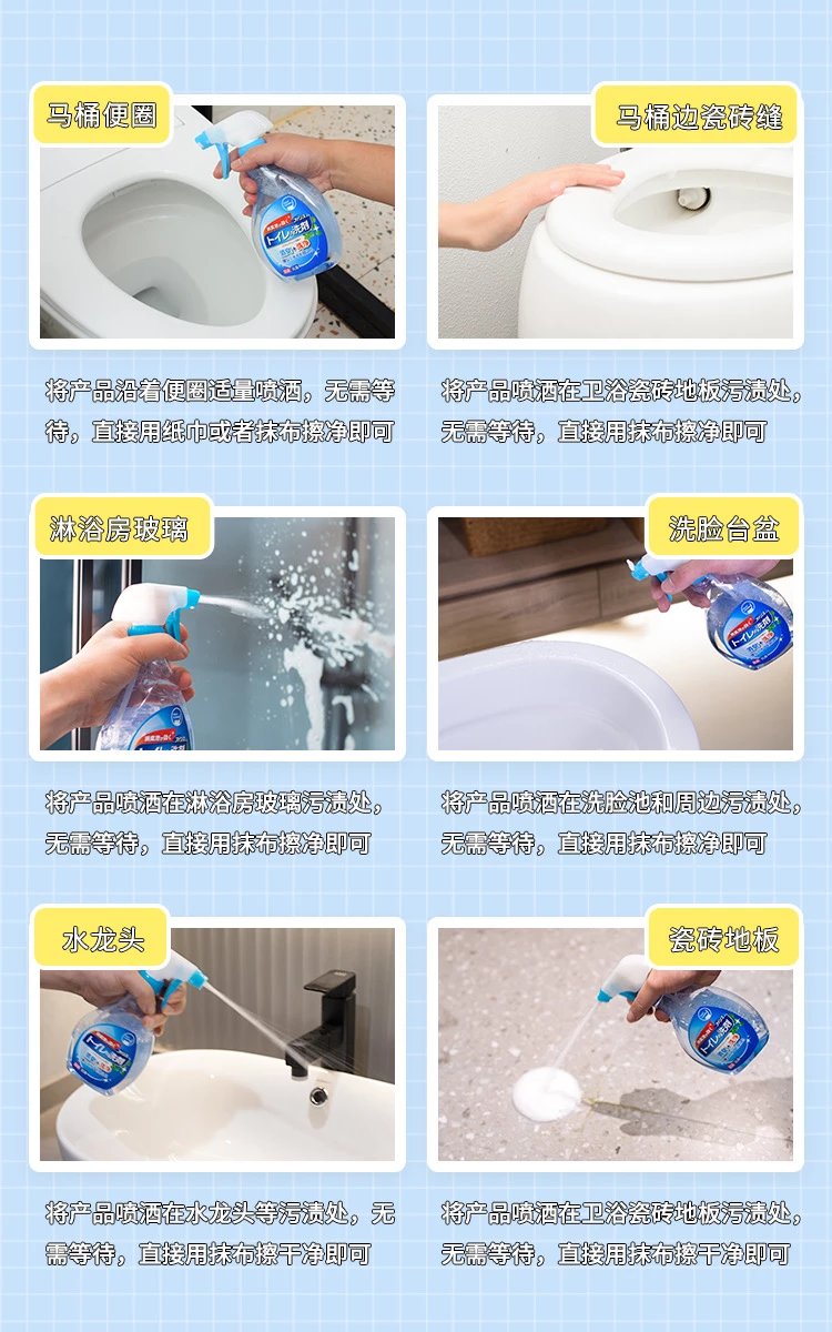 把它喷洒在马桶便圈周围的尿渍,污渍、硬水渍及污秽堆积处,然后直接用拿纸巾或者抹布擦干净就ok,方便高效