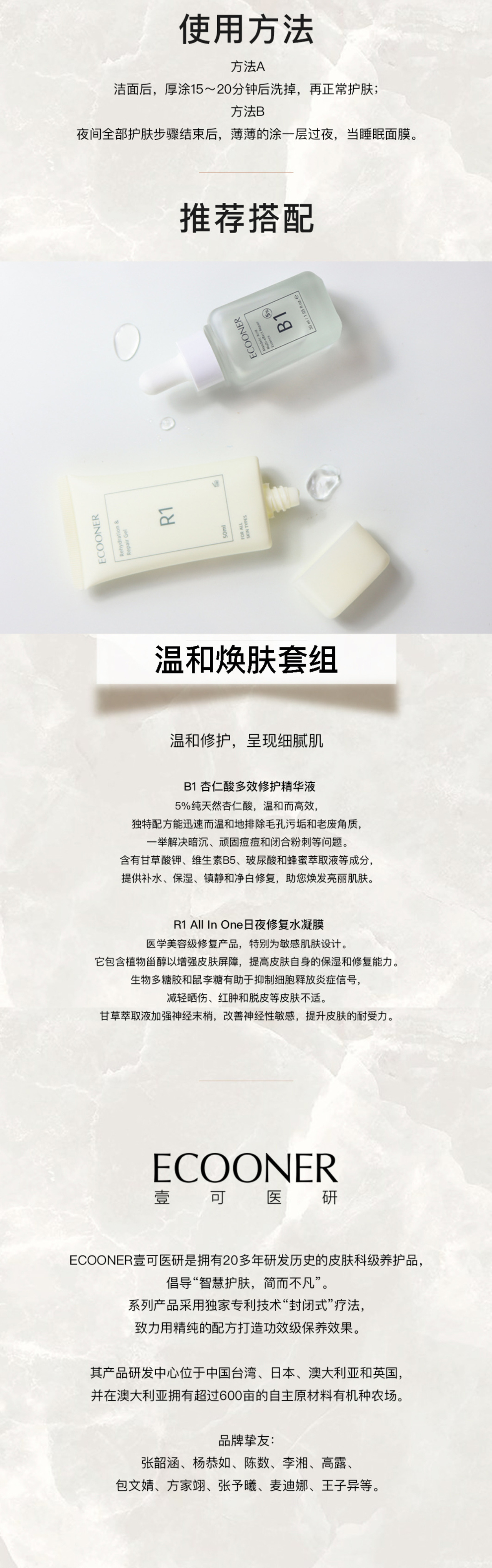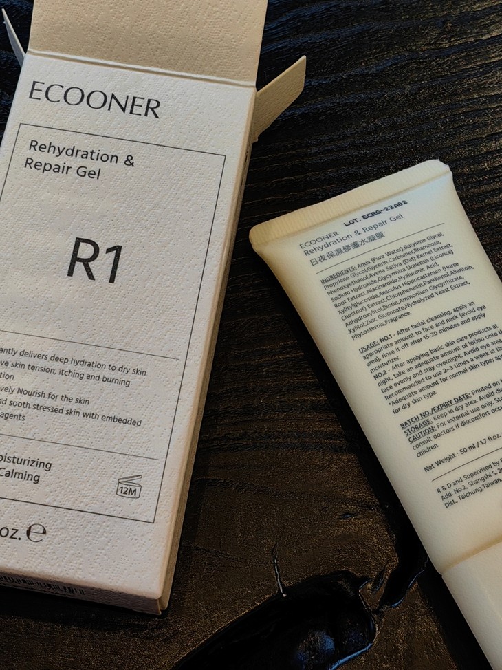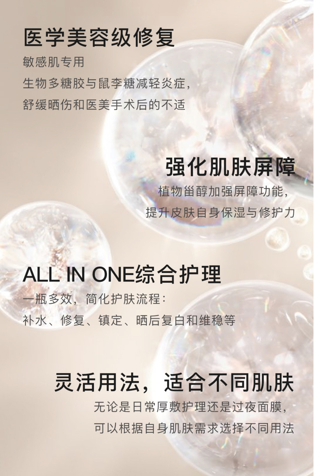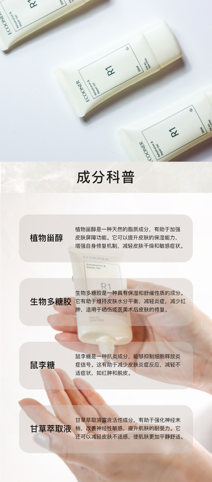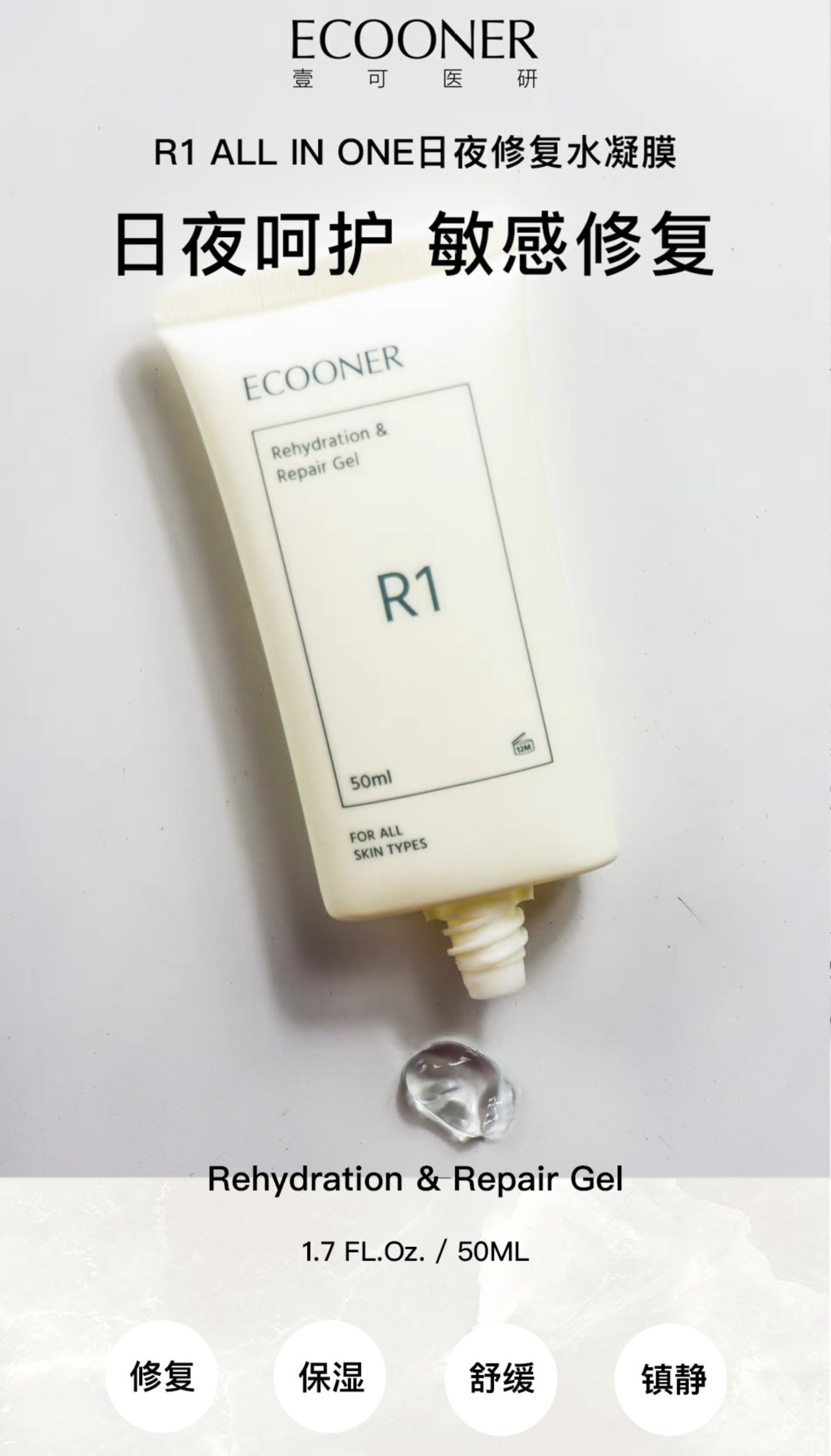 EC的R1,也就是All In One日夜修复水凝膜,是医美级修复产品,特别为敏感肌设计。它包含植物甾醇以增强皮肤屏障,提高皮肤自身的保湿和修复能力。还有生物多糖胶和鼠李糖,有助于抑制细胞释放炎症信号,减轻晒伤、红肿和脱皮等皮肤不适。再加上甘草萃取液,加强神经末梢,改善神经性敏感,提升皮肤的耐受力,使肌肤更加平静舒适。
