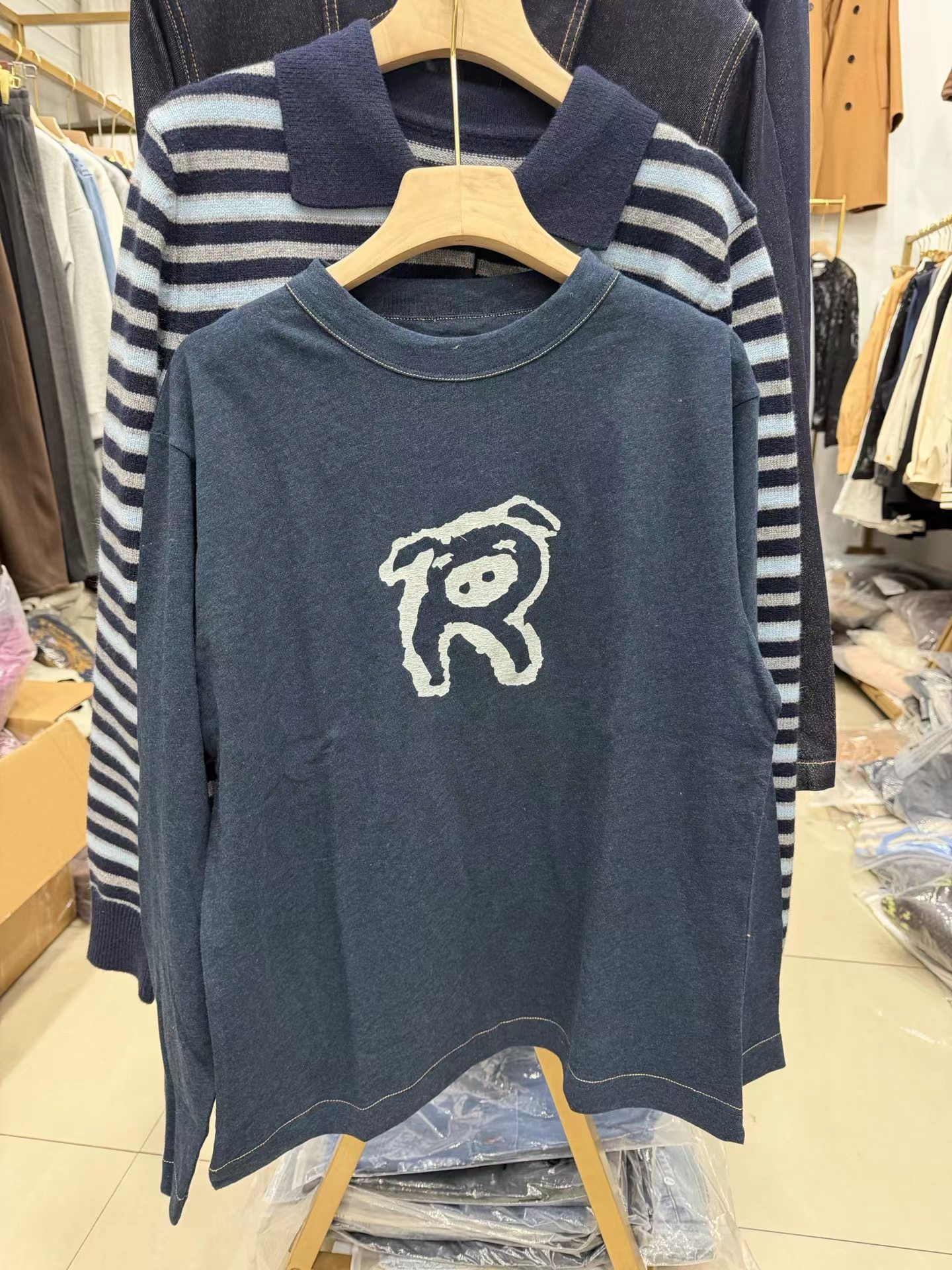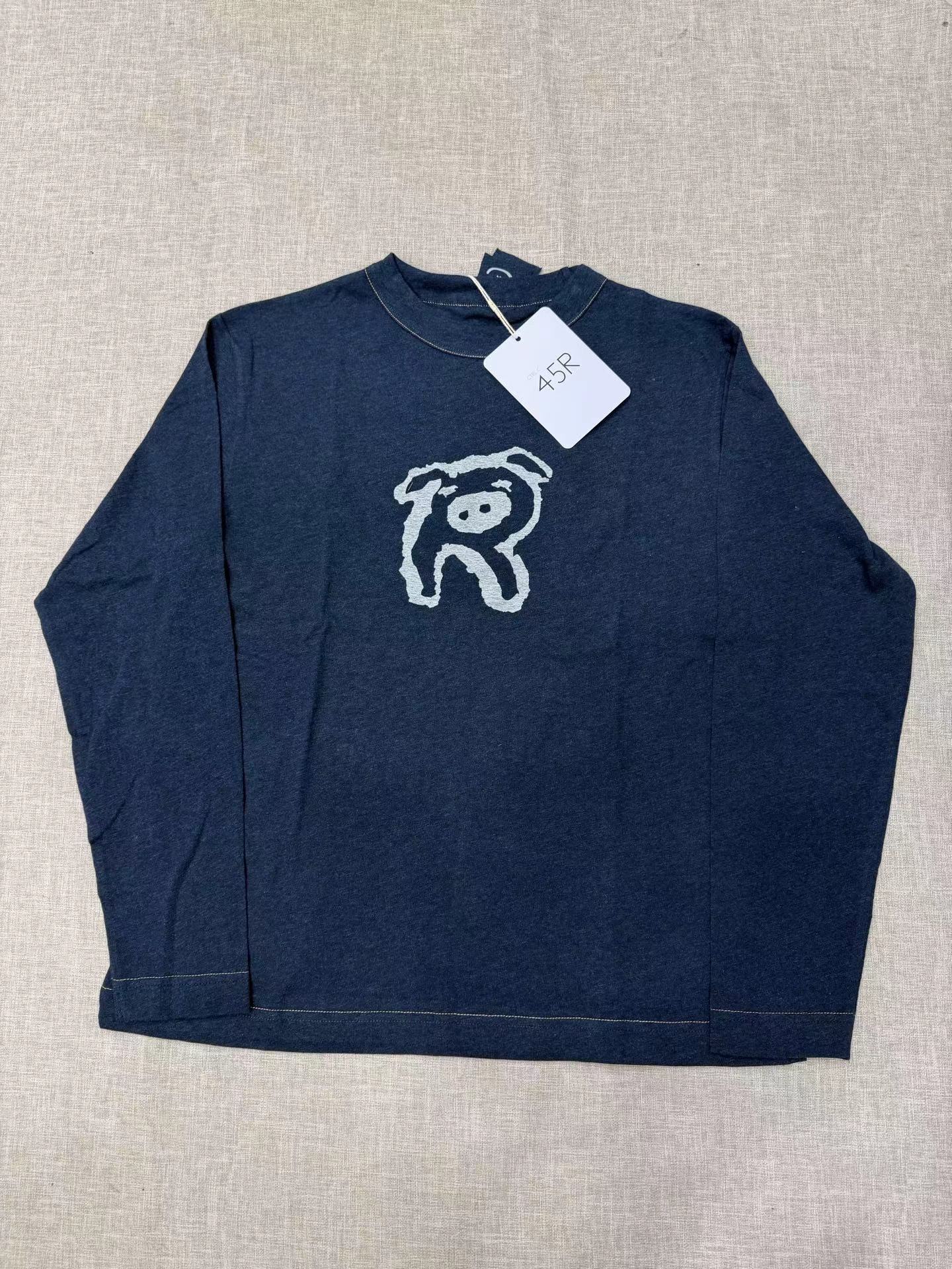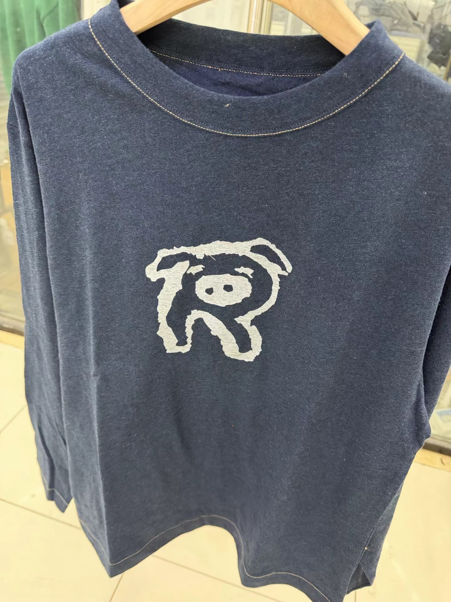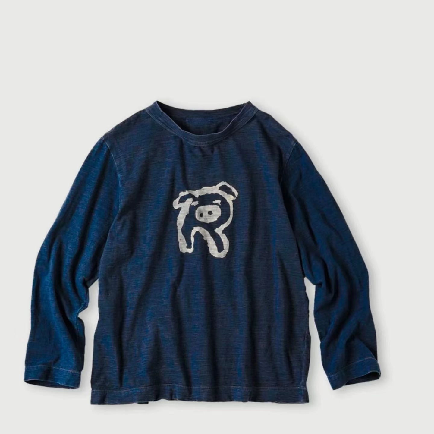F011344竹节棉蓝染可爱小猪印花长袖T恤男女同款