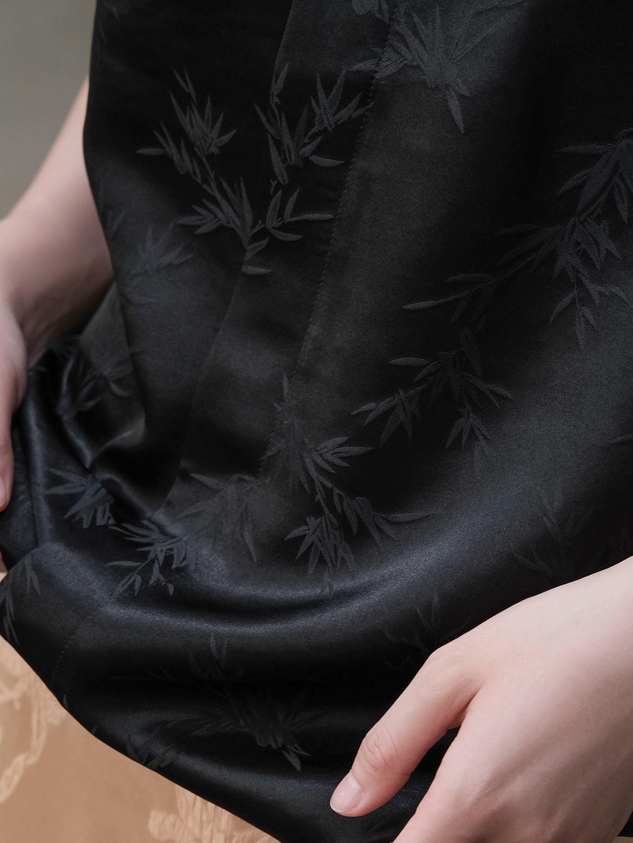 盛唐牡丹 |黑色文竹交叉领真丝提花背心