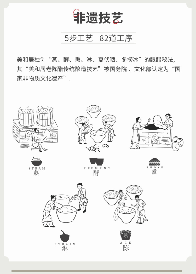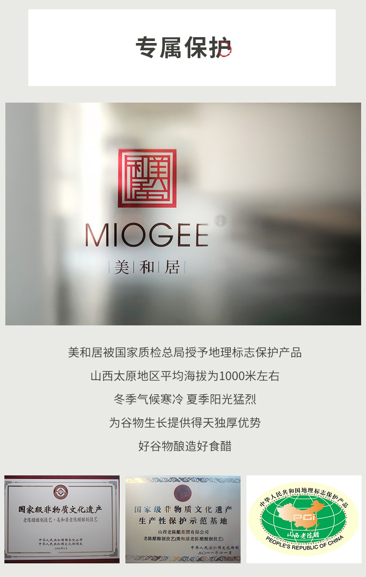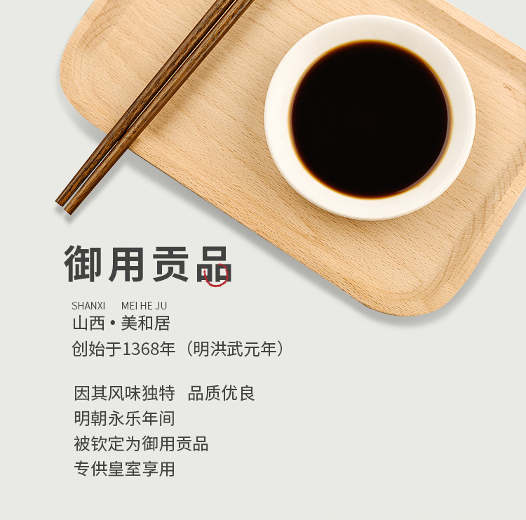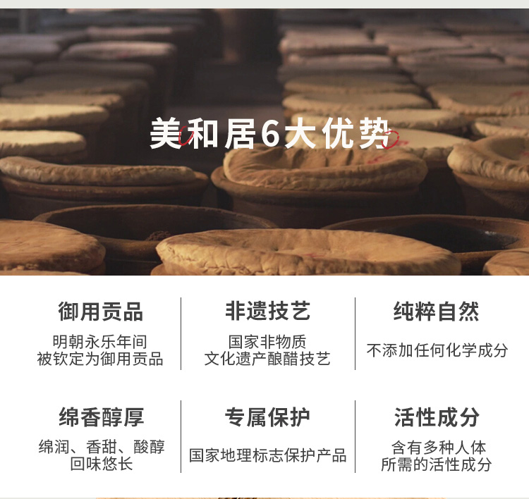 - 美和居始创于1368年,为山西老陈醋开创者,国家级非物质文化遗产酿制技艺,国家地理标志保护产品!