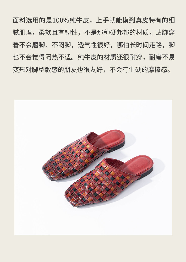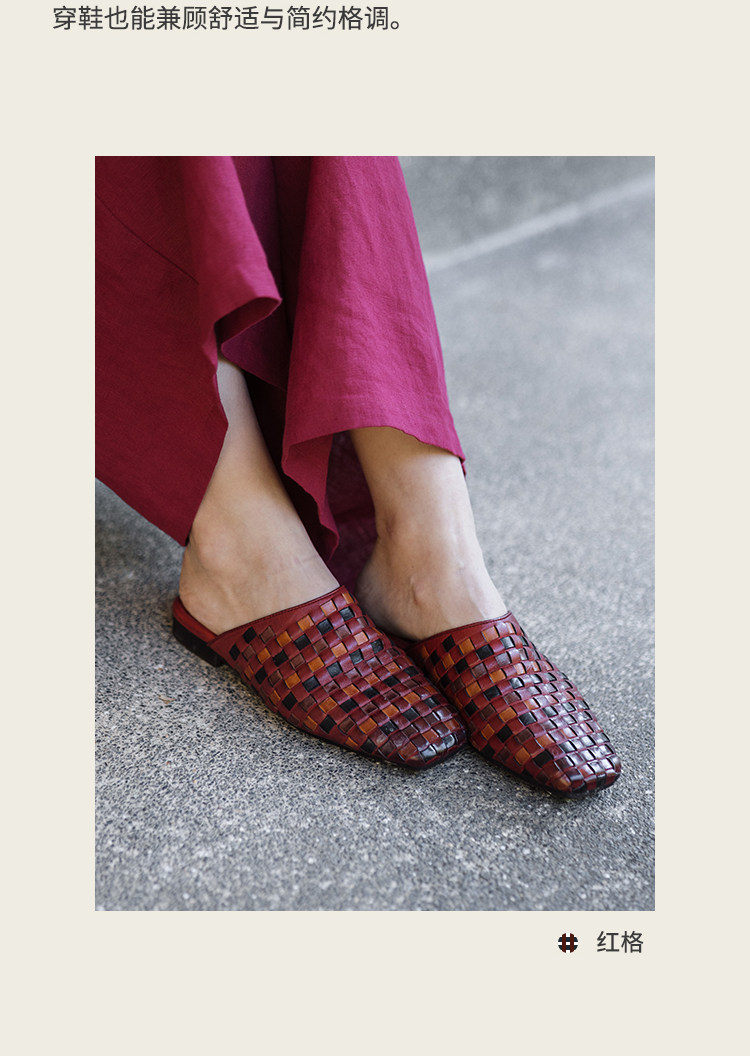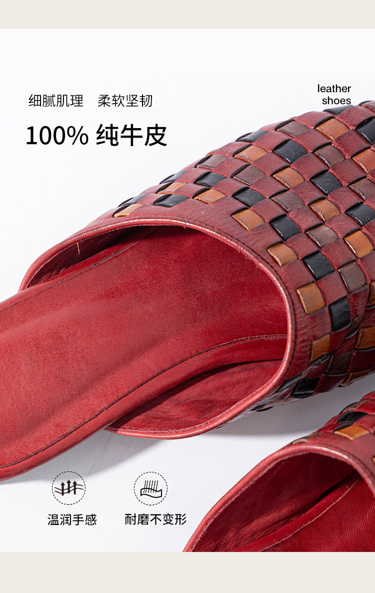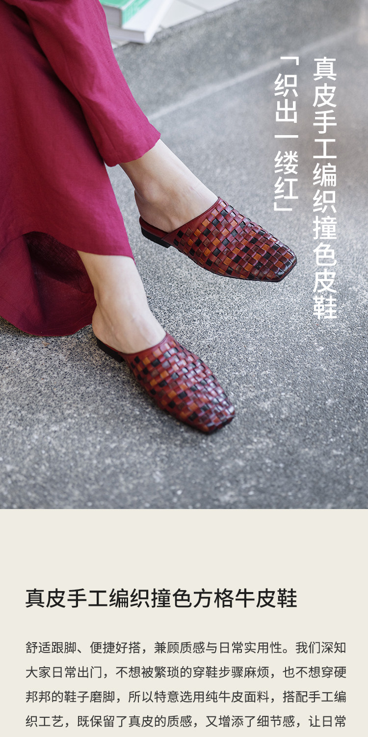 绽放/LSX017朵织出一缕红*新款纯牛皮手工编织撞色方格一脚蹬皮鞋