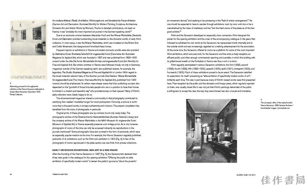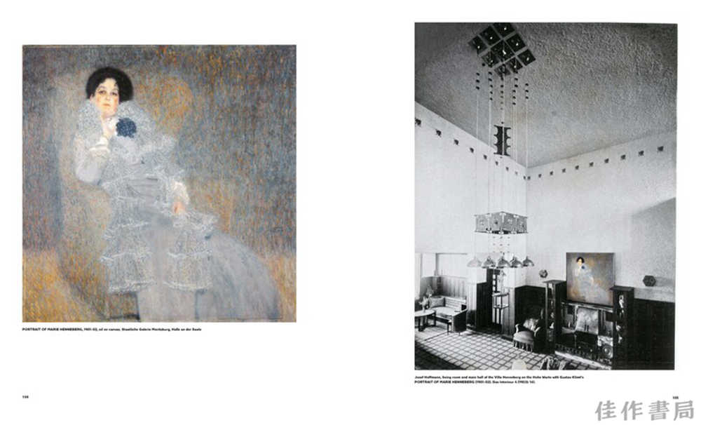 室内设计对古斯塔夫·克里姆特来说极为重要,他的许多画作都是为特定环境而创作的。他作品中的这一特点在这本书中得到了淋漓尽致的展现。它展示了这位艺术家最受喜爱的几幅画作在私人住宅和公共展览空间中的呈现方式。如备受赞誉的阿黛尔·布洛赫-鲍尔、艾米莉·弗洛格和索尼娅·克尼普斯的肖像画,令人震惊的寓言作品如《L体真理》和《希望一》,以及郁郁葱葱的风景画,都按照克里姆特生前在原地的展示方式呈现。全彩复制品的克里姆特画作与历史黑白照片并列,这些照片记录了原始室内环境,并以彩色叠加展示了特色画作。