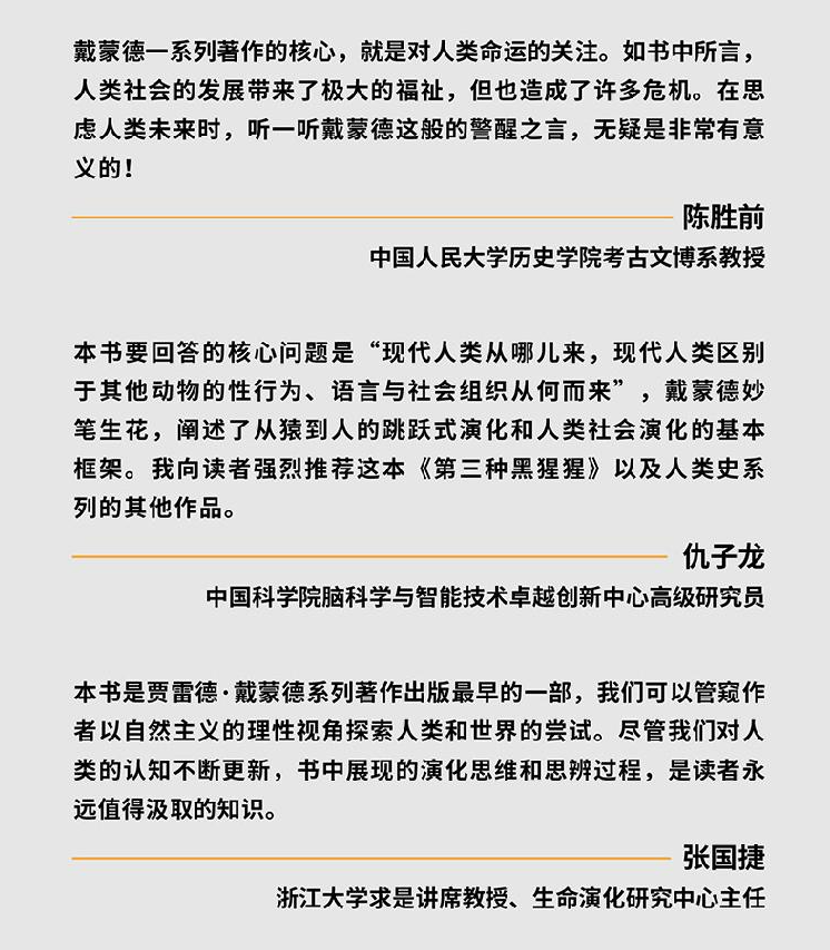 贾雷德·戴蒙德从多个方面讨论了上述问题。作为一个生理学家,他谙熟于人类的生理特征和演化史,正是因为有了这些生理基础,人类才得以演化出不同于其他动物的生命周期,这是我们成为人的前提。但戴蒙德的叙述没有止步于对生理层面的解释,而是将眼光延伸到人类多层面的文化表现和社会发展。我们拥有语言、艺术、文明,自诩“万物灵长”,但人性光辉的另一面也充满阴暗纠葛——拥有多元文化,发展先进科技,创造灿烂艺术的是人;嗜毒成瘾、仇杀外族、灭绝物种、破坏环境的也是人。当我们跟随作者的脚步,贯穿科学与人文,追溯人类的本原,印证人从动物界兴起的足迹,也许将重塑我们对人何以为人的认知,认清人之本性。人类的未来或许正根系于此。