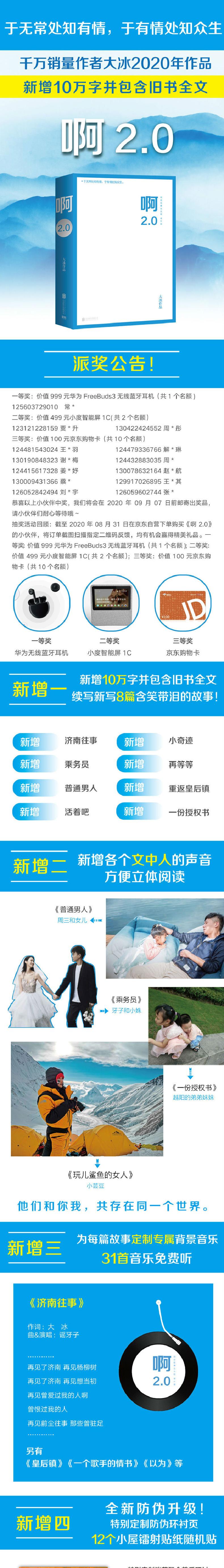 《啊2.0》在包含旧书全文基础上,新增10万字。新写《济南往事》、《乘务员》等故事;续写《一份授权书》《小奇迹》等故事。文字为生第8年,大冰坦诚讲述自己在济南的沉浮岁月;另将感动万人的白血病少年越阳的故事,影视改编权免费授权。
