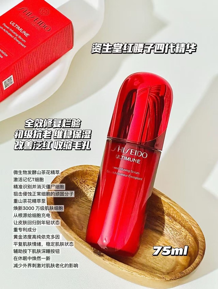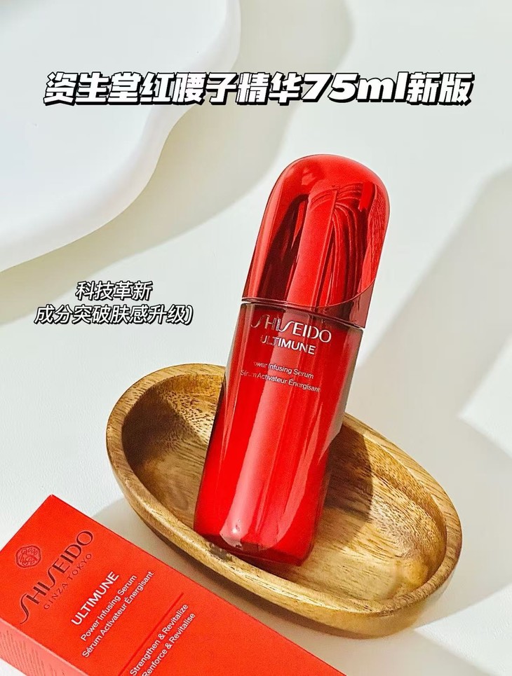 👑资生堂红腰子精华 75ml (2025) ✨最大亮点:从一款维稳修护精华,升级:细胞超级抗老的全能型精华 💦核心科技:“记忆T细胞”抗老科技,清除老化细胞,召唤新生细胞 💯从根源上减少皮肤老化,从内到外变得紧致透亮 💎日防夜修:白天舒缓,抵御刺激,晚上强力修护,适合熬夜党 💥清透蛋清质地,上脸吸收快,不粘腻 💁适合:追求维稳和抗老双效的懒人,以及熬夜党、肌肤泛红敏感人群