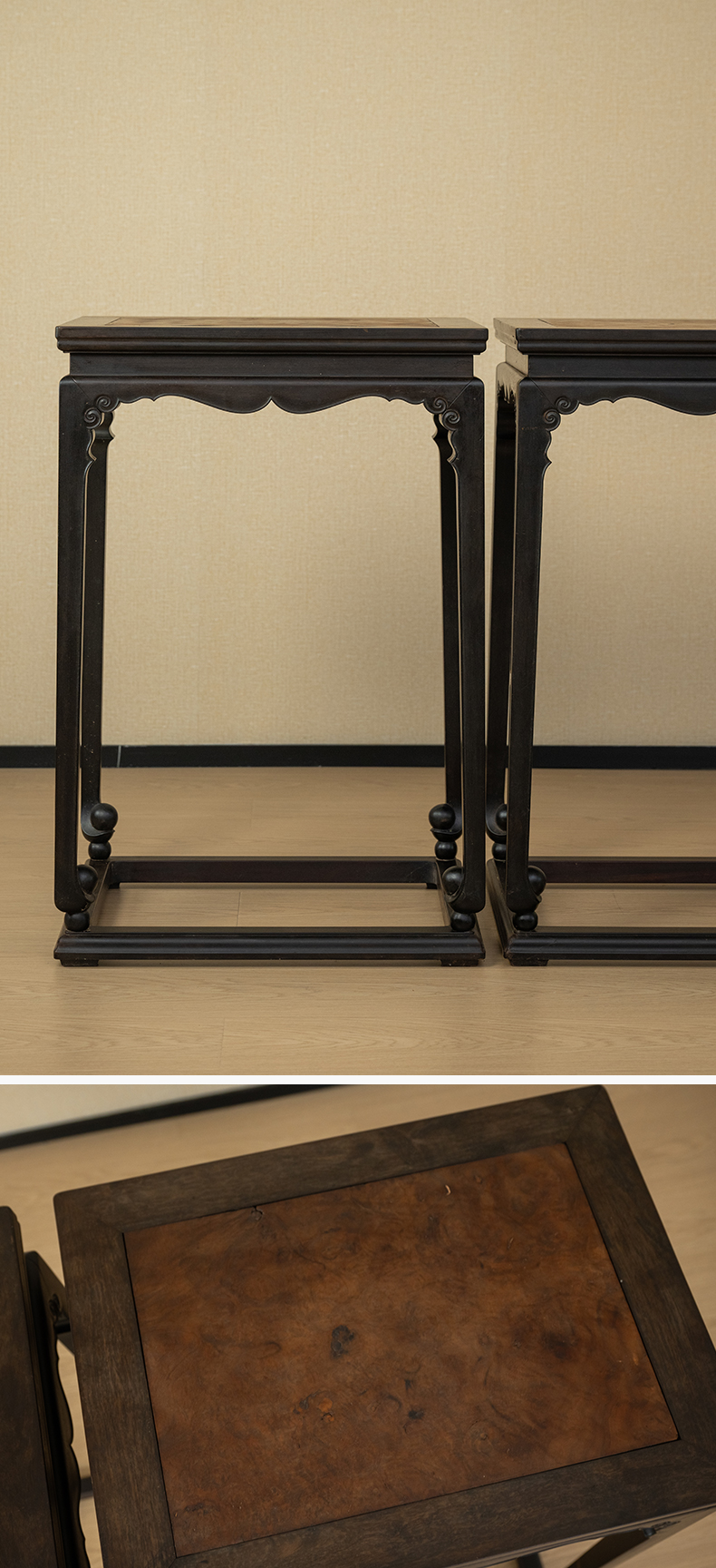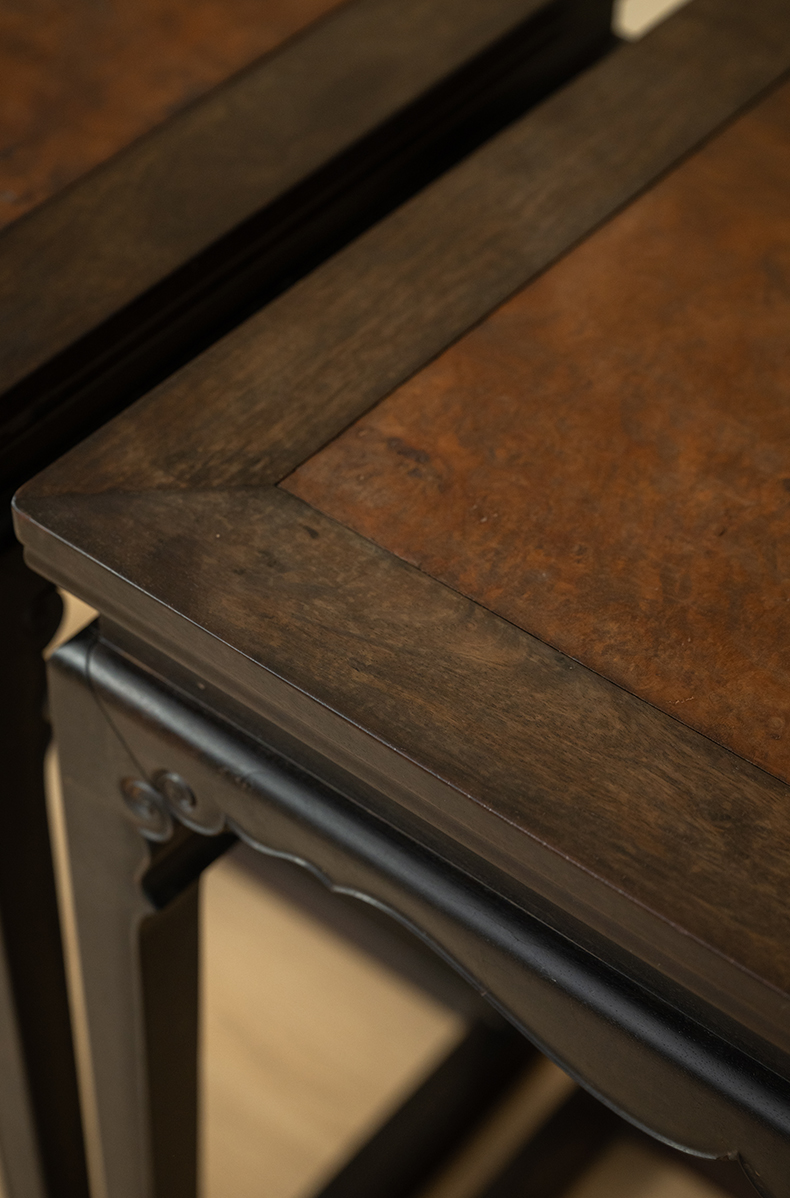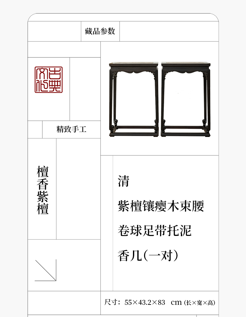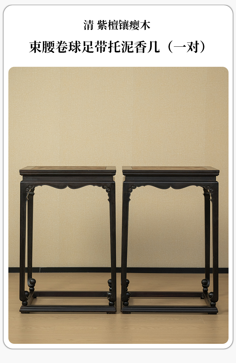 清 紫檀镶瘿木束腰卷球足带托泥香几(一对)