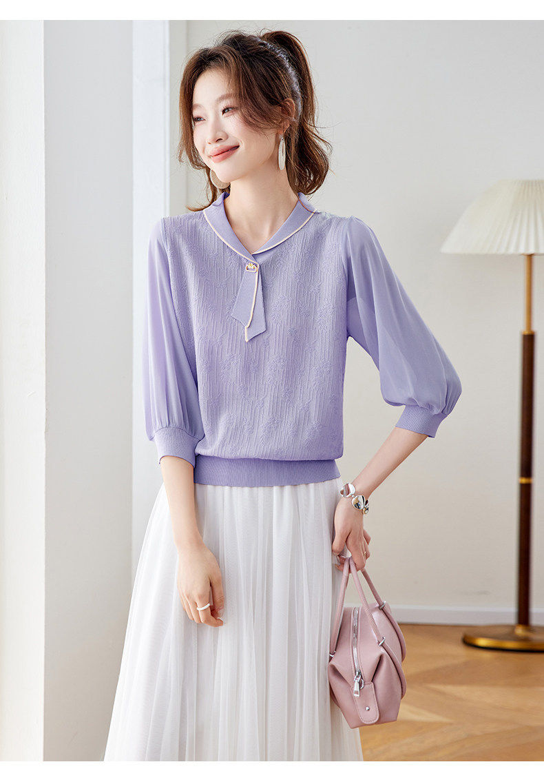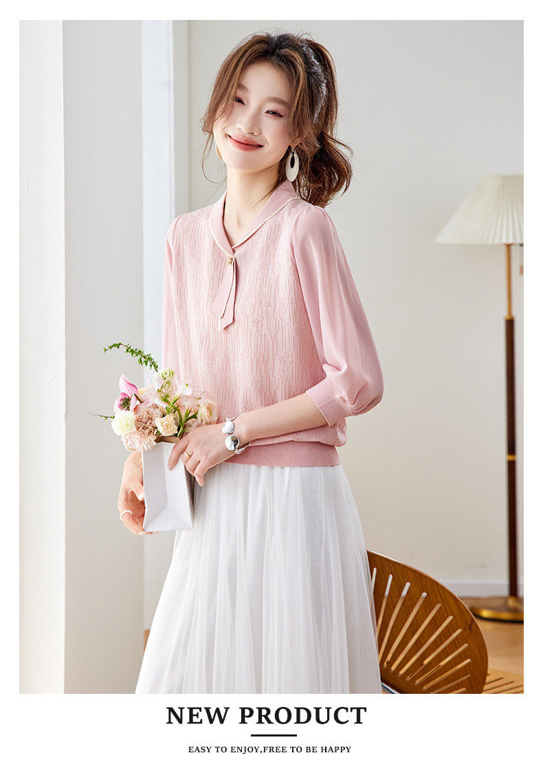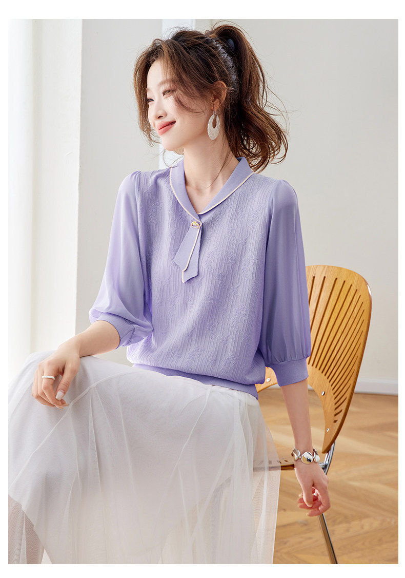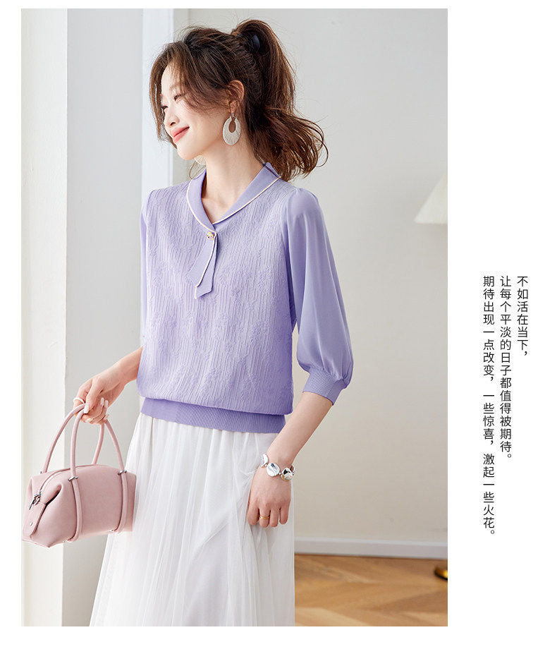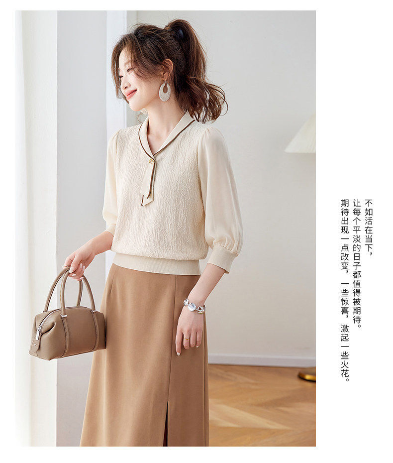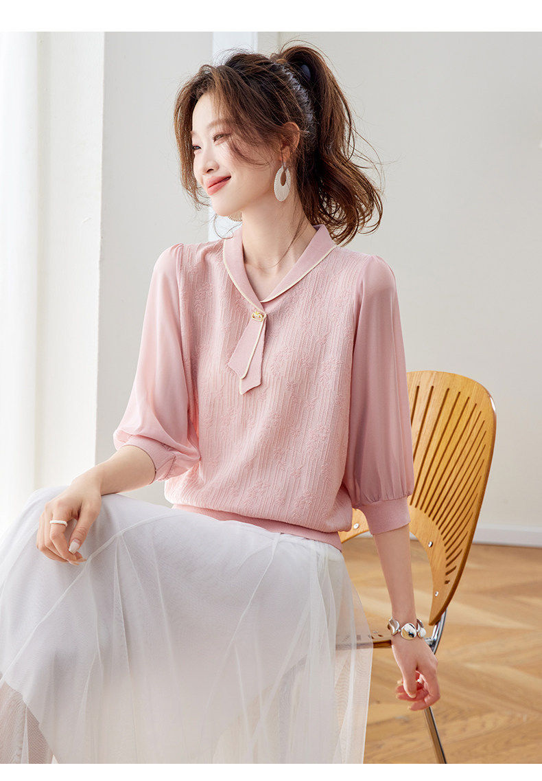 「自」全新升级【铂金会员192/天猫259/差价67】(02810)洛诗琳气质拼接五分袖上衣2026春季薄款淑女风系带针织T恤