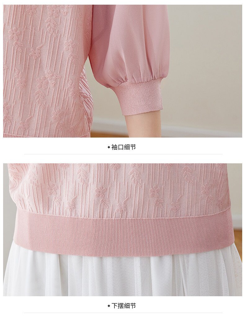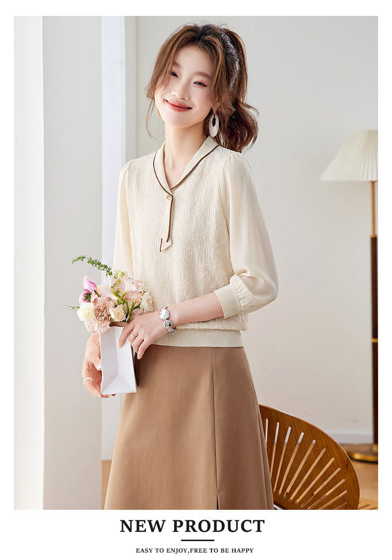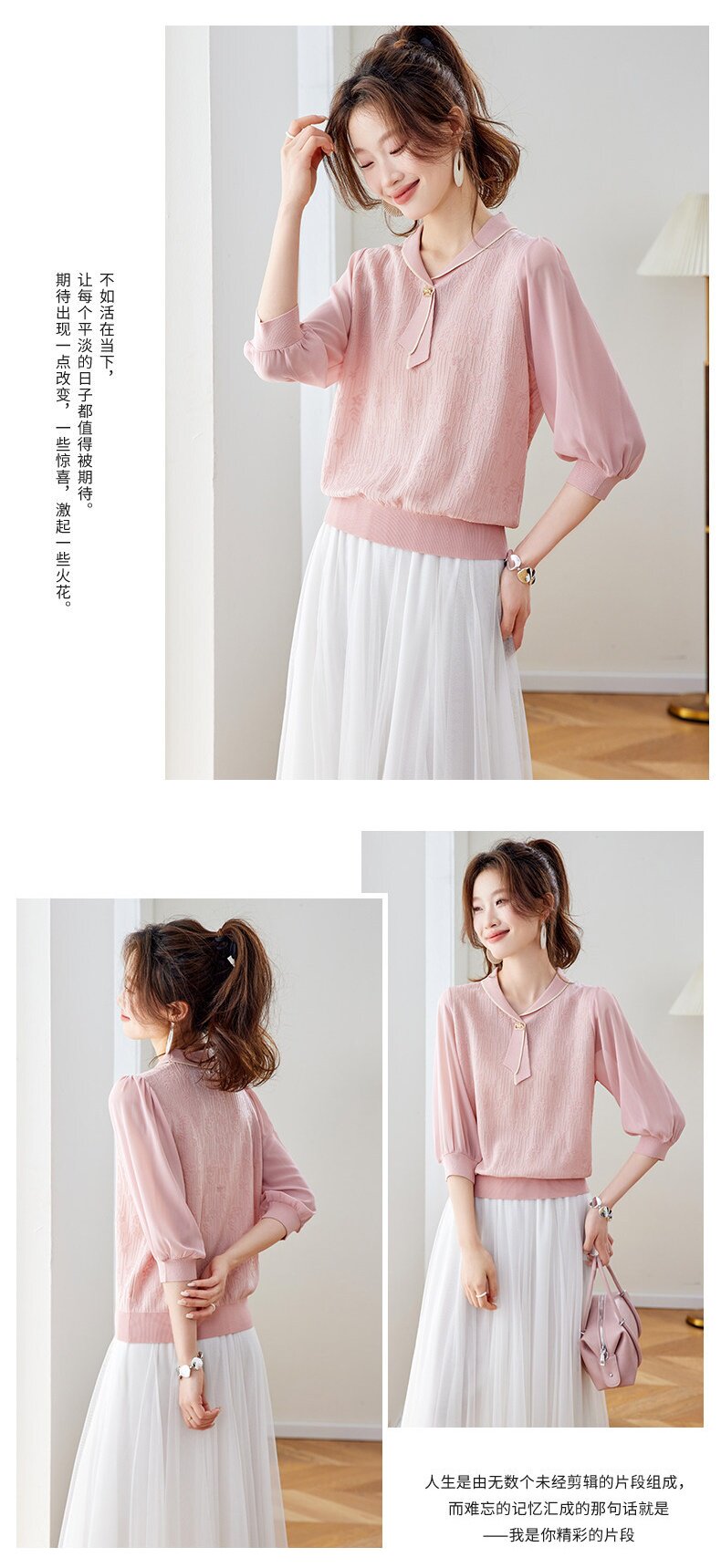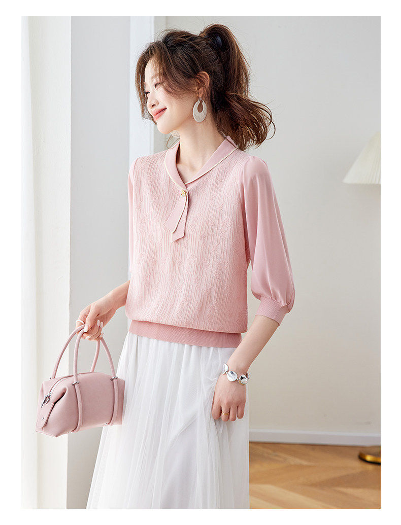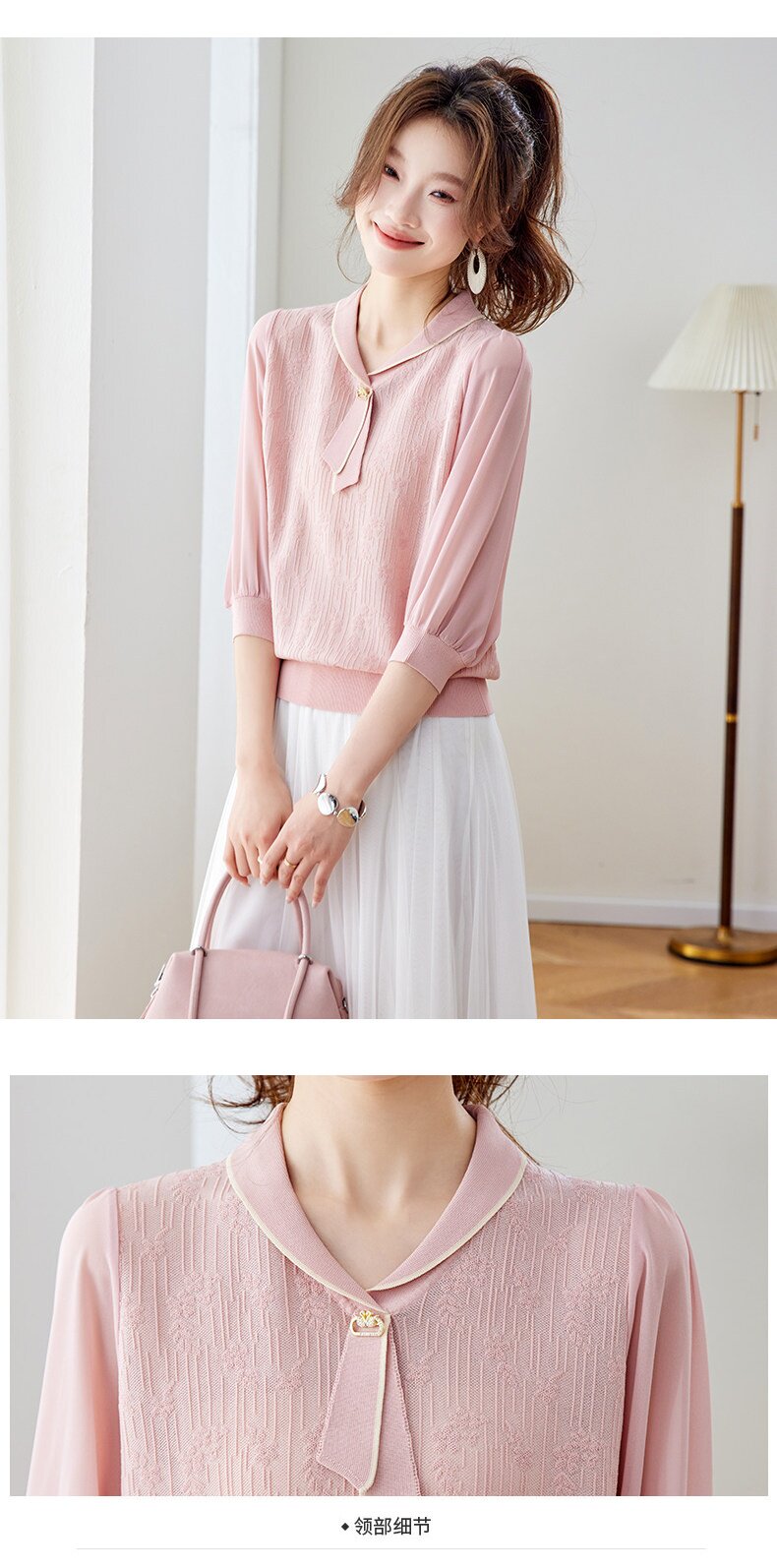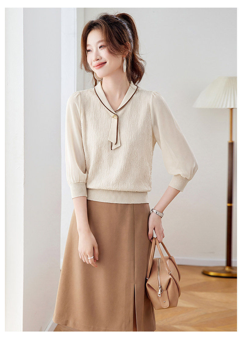 「自」全新升级【铂金会员192/天猫259/差价67】(02810)洛诗琳气质拼接五分袖上衣2026春季薄款淑女风系带针织T恤