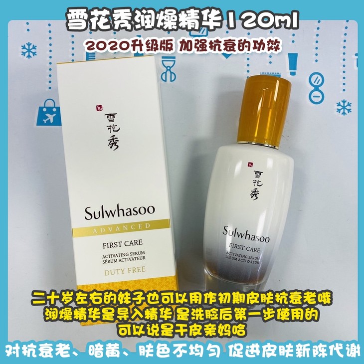 雪花秀润燥精华120ml👍#2020升级版,加强抗衰的功效👊,二十岁左右的妹子也可以用作初期皮肤抗衰老哦。润燥精华是导入精华🔜,是洗脸后第一步使用的,可以说是干皮亲妈哈,主打滋养和调理💦。滋润补水为肌肤提供水分和营养,对抗衰老、暗黄、肤色不均匀,促进皮肤新陈代谢💪,同时也适合换季肌肤养护🍂。拥有这个精华相当于拥有了健康好肤质〰。