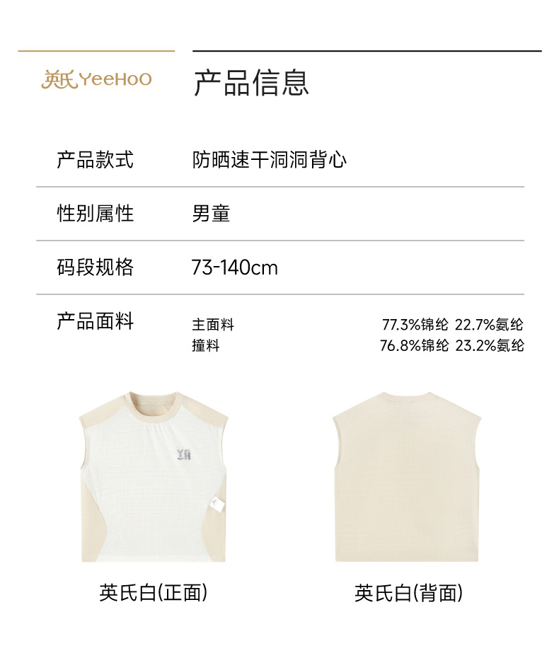 【商场同款】英氏男宝背心夏新款圆领透气无袖背心儿童抗菌打底