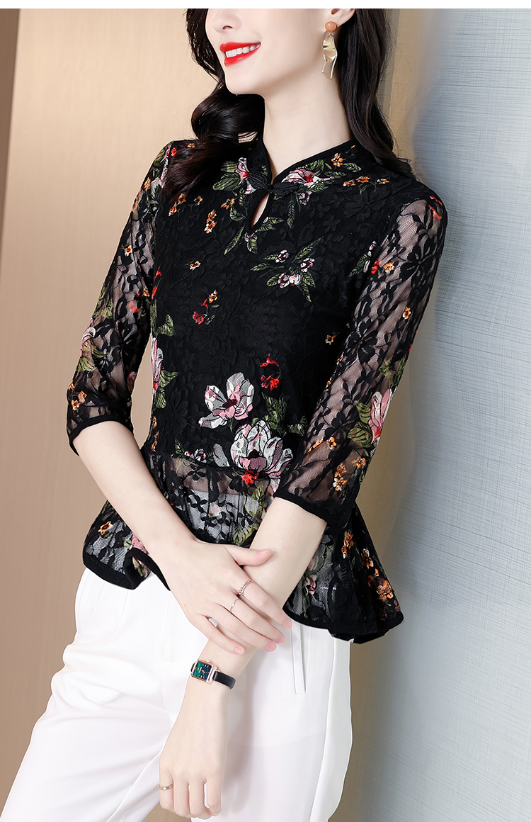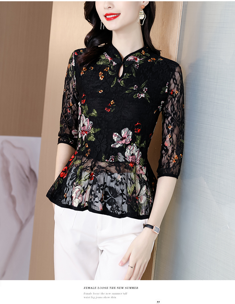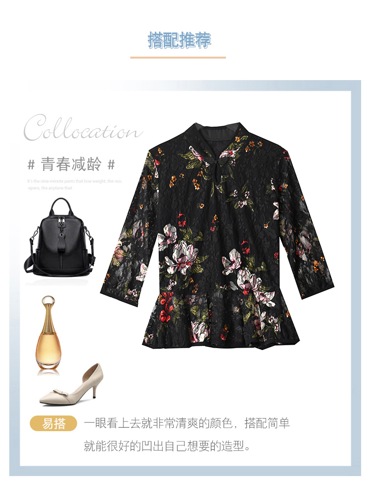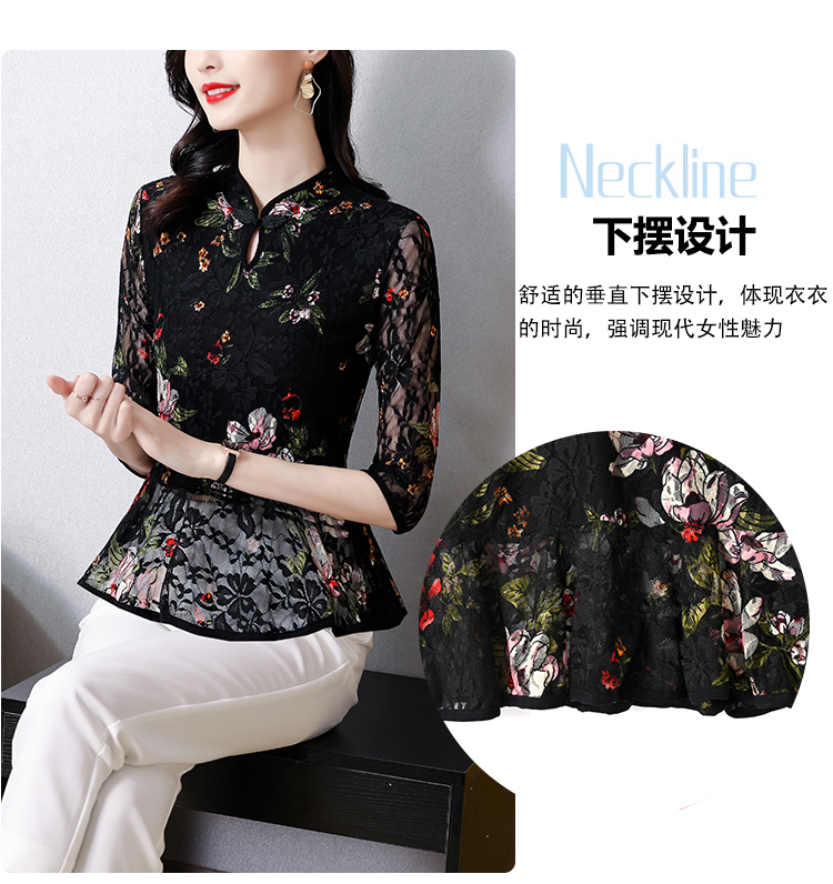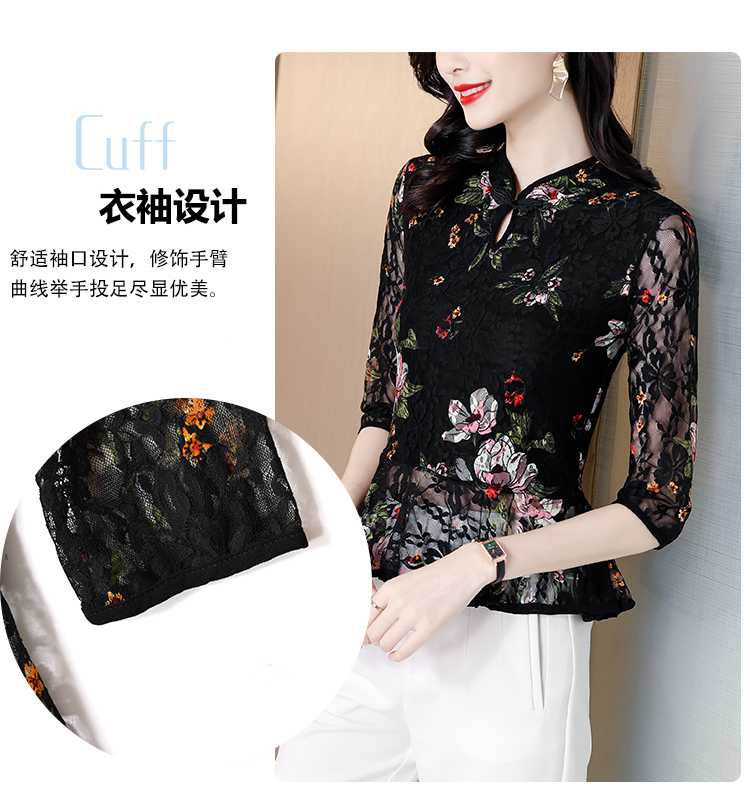 2022新款小衫收腰裙摆上衣女贵夫人漂亮碎花蕾丝衬衫女七分袖MZ804036