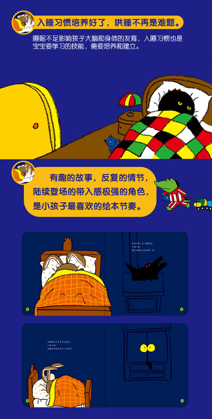 1.通过代入感强的互动绘本故事培养独立睡眠习惯,顺利度过分床过渡期,缓解睡前焦虑和恐惧感,解决孩子哄睡难,睡前拖拉、哭闹、黏人等问题。