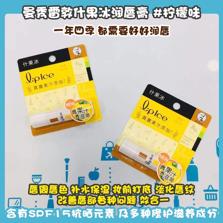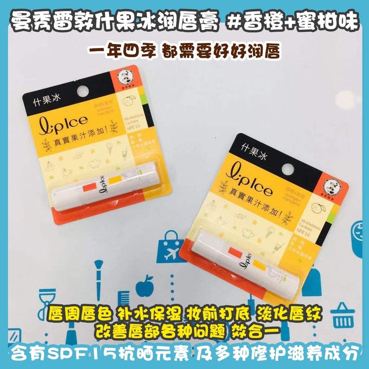 曼秀雷敦什果冰润唇膏 #香橙+蜜柑味/#草莓味/#苹果味/#柠檬味👍一年四季🍁,都需要好好润唇👄!这款提亮唇周唇色✨,补水保湿💦,妆前打底,淡化唇纹,改善唇部各种问题6️⃣效合一。含有SPF15抗晒元素☀及多种修护滋养成分,冰凉清新抵御干燥缺水气候🍃,及猛烈阳光或寒风的侵害❌,令双唇时刻健康柔润☺。