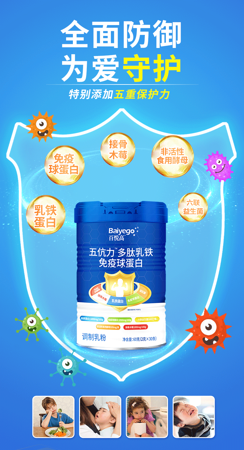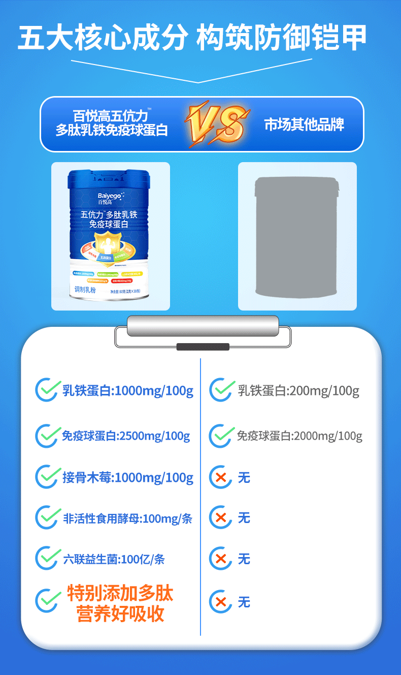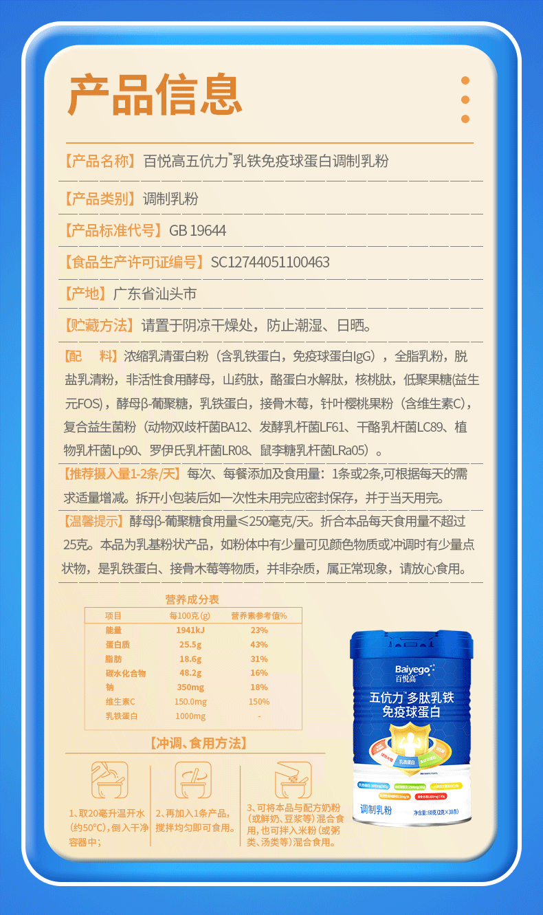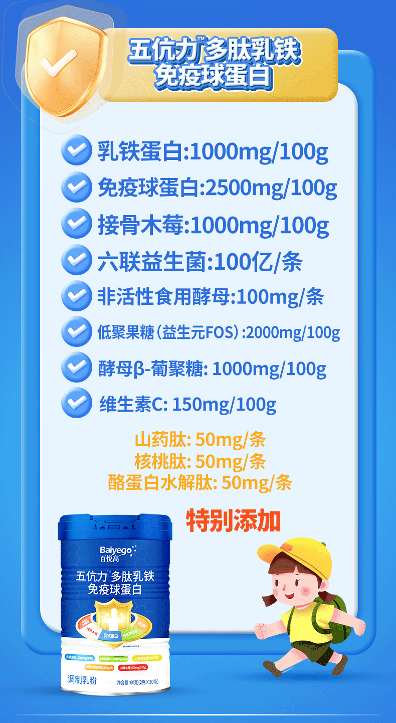 百悦高五伉力多肽乳铁免疫球蛋白粉30条/罐【拍1发2】
