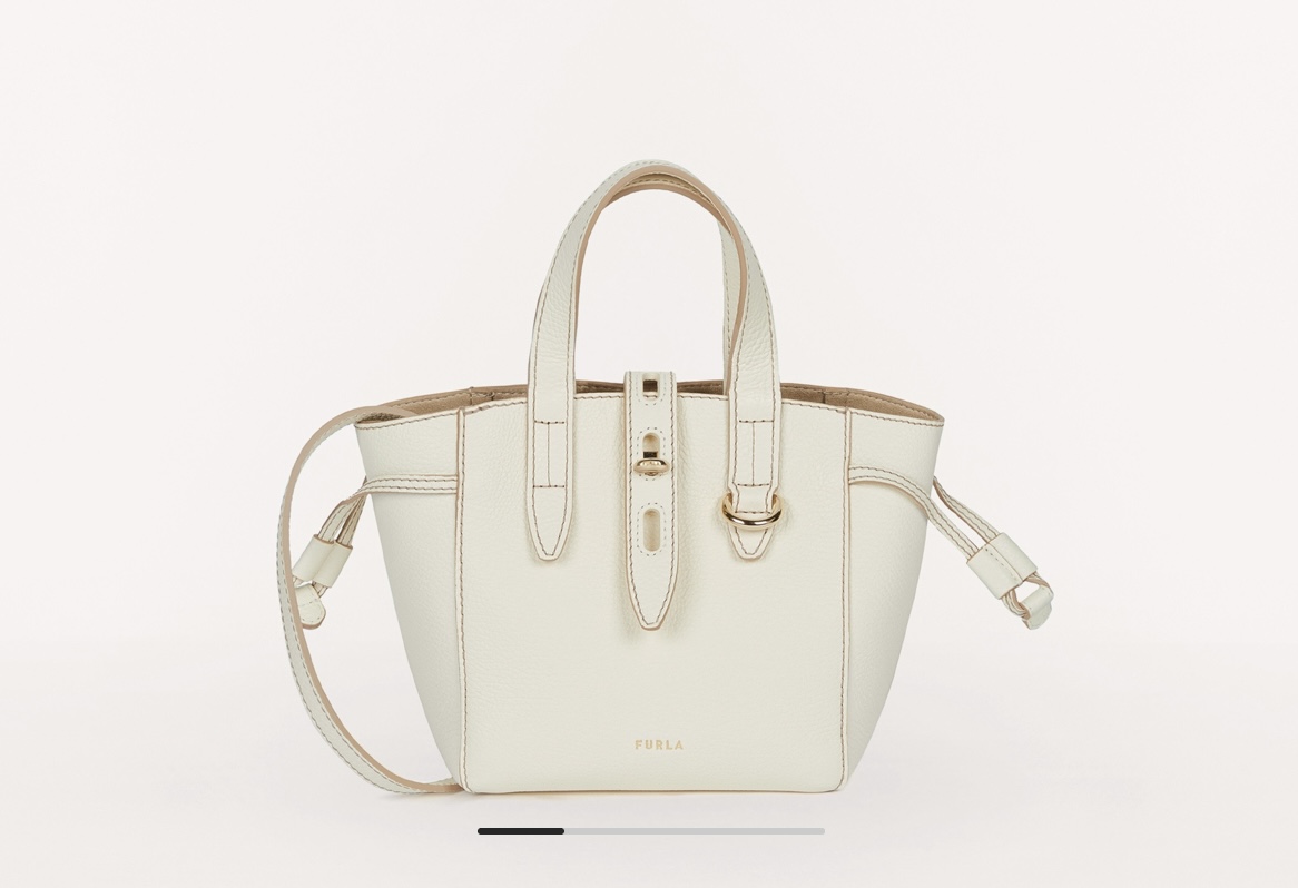 Furla Net托特包,粒纹小牛皮精制,搭配撞色内衬。可使用侧边抽绳系带调节包身大小。配有金属扭锁,皮革饰片点缀椭圆形孔洞装饰细节,增添别致饰面细节。